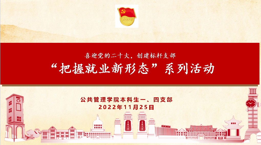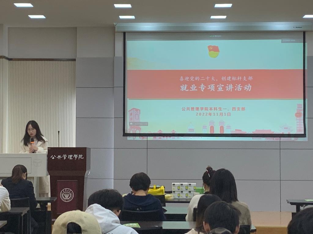 2022-11-29为满足应届生的择业需求,提高对企业的辨识能力, 电影天堂 本科生一、四支部于2022年11月1日下午4时在 电影天堂 楼102教室开展了“喜迎二十大,创建标杆支部”主题教育系列活动之就业专项宣讲活动本次活动由公管学院本科生一支部组织委员陈烨靖同志主持,邀请了长沙市益丰大药房的张部长和熊经理开展宣讲活动。本科生一、四支部全体党员全部参会,其中,未返校人员线上参会。首先,陈烨靖同志介绍了本次活动的主题。其次,...