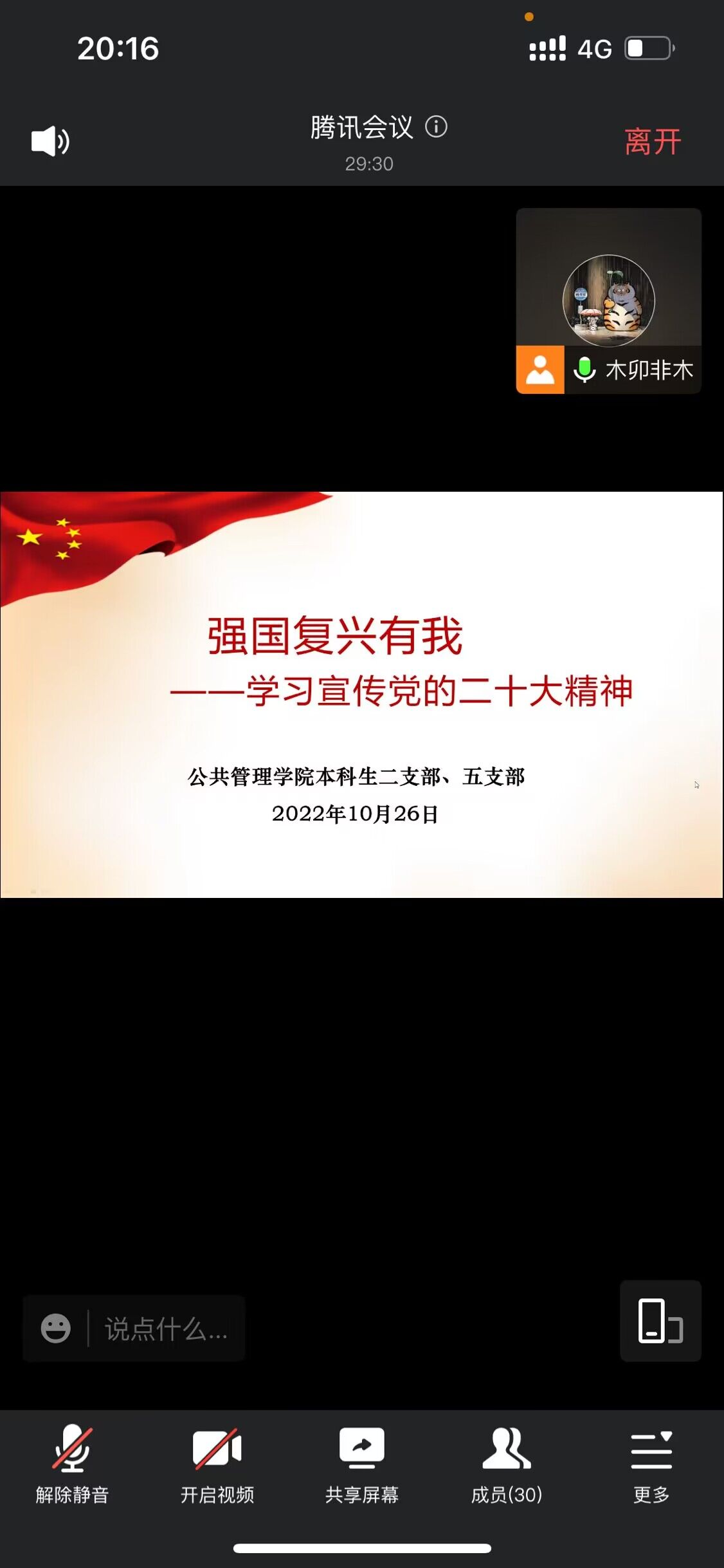 2022-10-272022年10月16日至22日,中国共产党第二十次全国代表大会在北京隆重召开。大会是在全党全国各族人民迈上全面建设社会主义现代化国家新征程、向第二个百年奋斗目标进军的关键时刻召开的一次十分重要的大会。2022年10月26日晚19点30分, 电影天堂 本科生二、五支部在线上开展了“强国复兴有我——学习宣传党的二十大精神”主题活动。此次活动由本科生二支部书记徐柳老师主持,本科2021级全体入党积极分子也积极参会。活动内容包...