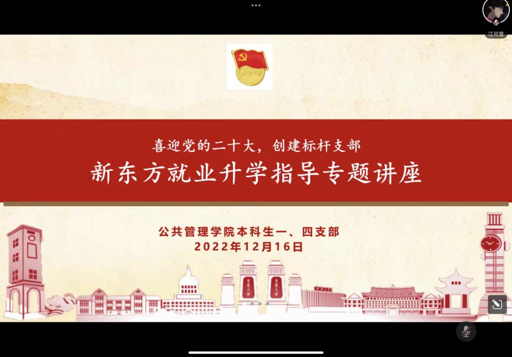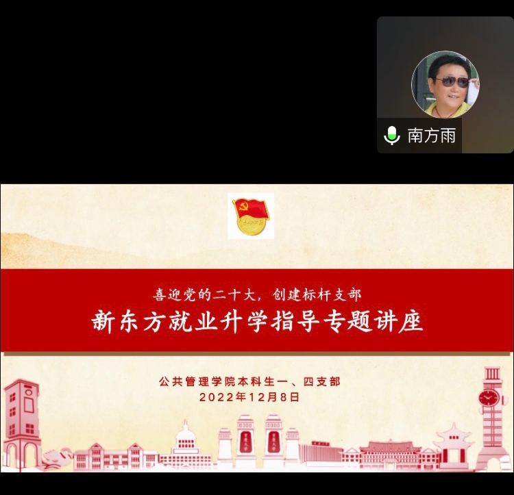 2022-12-21当下正值考研冲刺阶段,万千学子全力以赴,以求一战上岸,不负努力。2022年12月8日下午3时, 电影天堂 本科生一、四支部于腾讯会议举行了“喜迎党的二十大,创建标杆支部”主题教育系列活动之新东方就业升学指导专题讲座活动,本次活动是政治专题。 电影天堂 本科生一、四支部有幸邀请到新东⽅⼤学事业部重庆中⼼优秀教师田潇渊来做政治专题讲座分享。一、四支部同志以及报考研究生的同学均积极参与。首先,由一支部组织委...