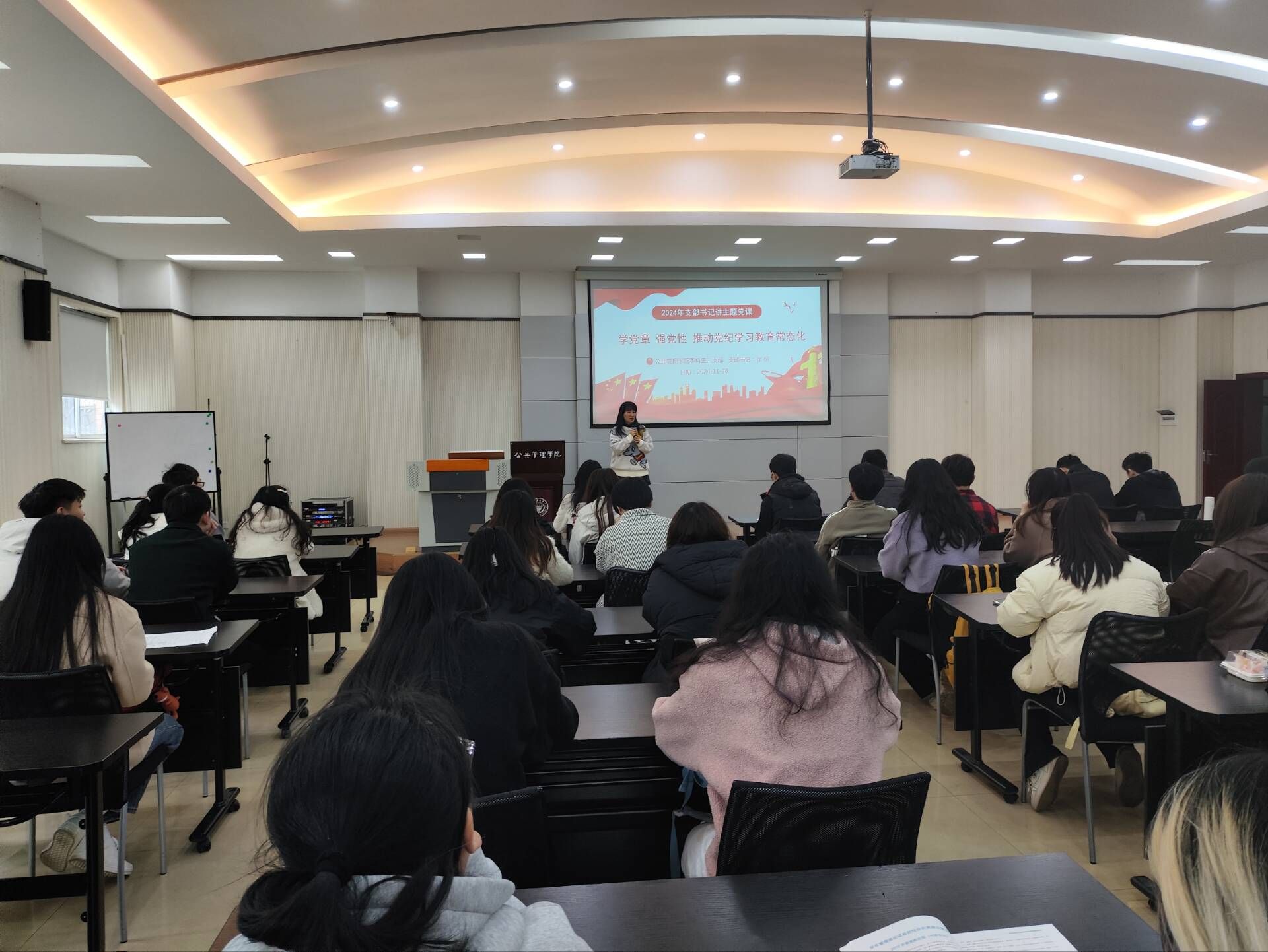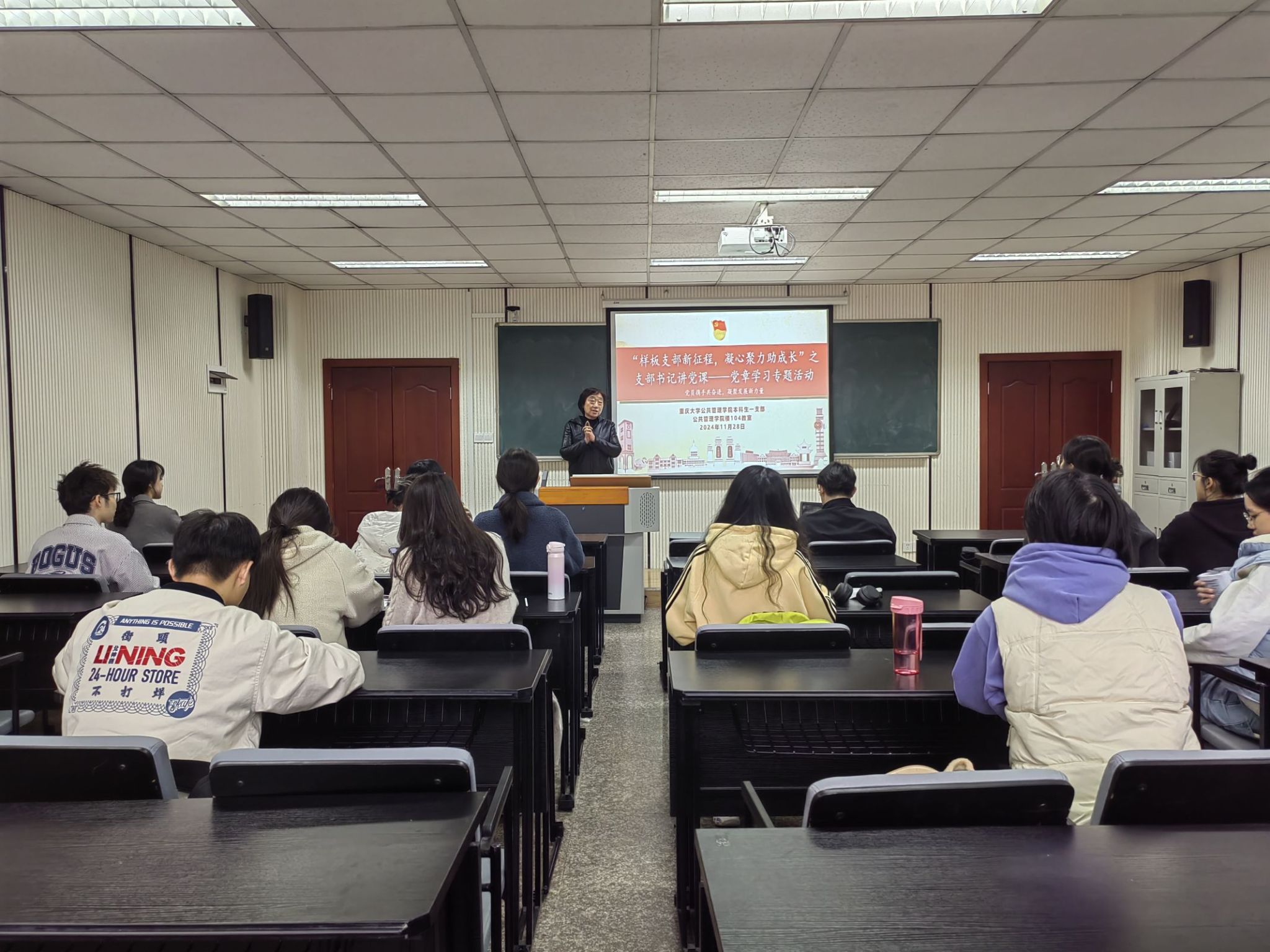2024-11-29支部共建、共发展,2024年11月28日13:00,学院本科生四支部在学院楼106教室成功举办了“样板支部新征程,凝心聚力助成长”——支部书记讲党课之党章学习教育活动。本次活动旨在深入推进学习贯彻习近平新时代中国特色社会主义思想主题教育,全面深入地学习、认识和贯彻《中国共产党章程》的重要精神。由本科生四支部书记袁凤主讲,学院本科生四支部全体党员、预备党员及入党积极分子积极参加了此次活动。活动伊始,袁凤书记以...