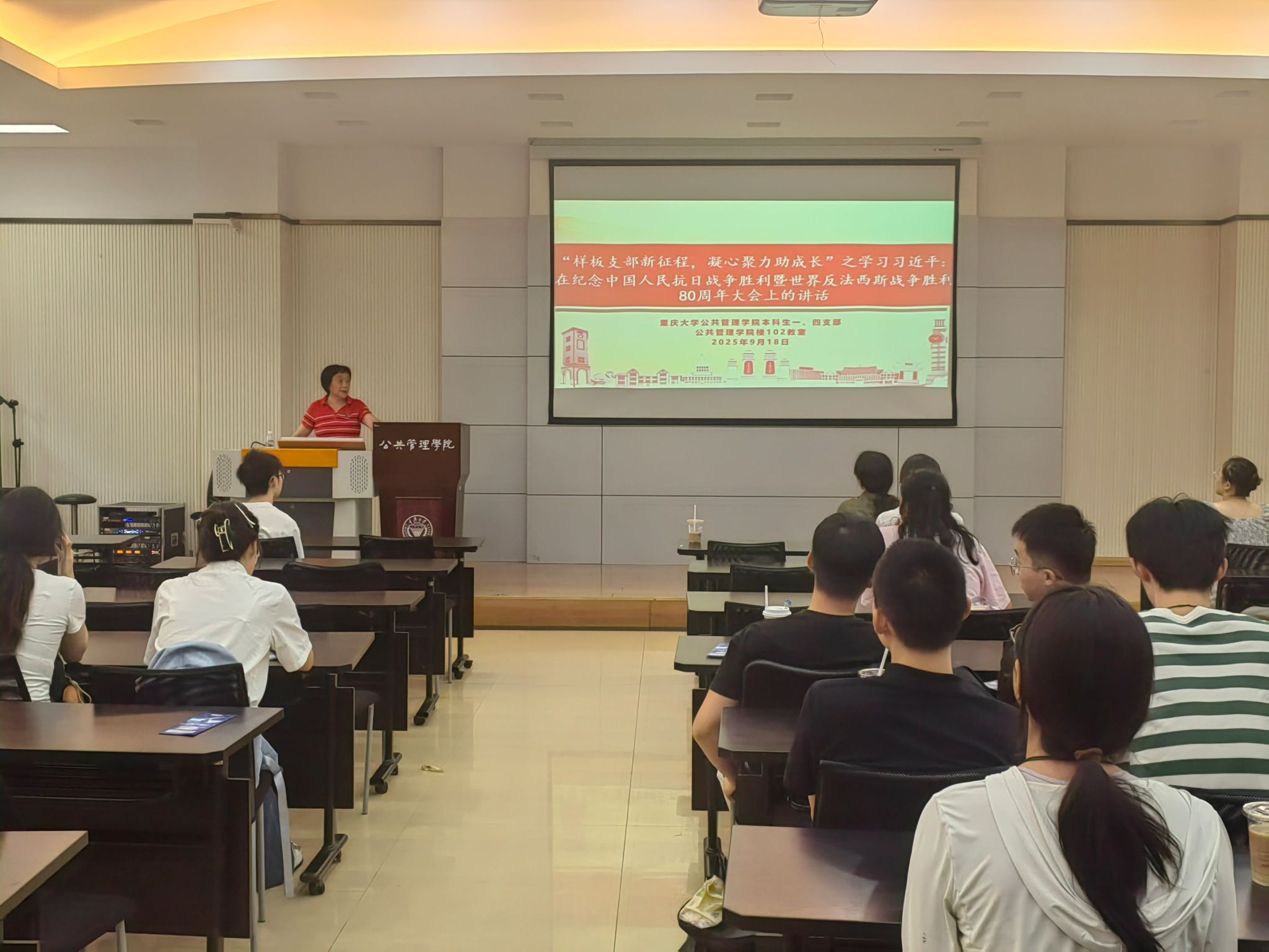 2025-09-252025年9月18日下午18点, 电影天堂 本科生一、四支部在学院楼102会议室开展了“样板支部新征程,凝心聚力助成长”系列活动,本次活动主题为学习习近平在纪念中国人民抗日战争暨世界反法西斯战争胜利80周年大会上的讲话。活动旨在通过深入学习讲话精神,加强学生的爱国主义教育,提升思想觉悟,激发爱国热情。由本科生一支部书记王丽娟主讲,本科生一、四支部的全体党员积极参与本次组织生活。活动伊始,全体与会人员共同观看...