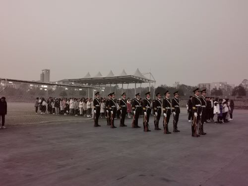 冬至来临,早晨的天还没有亮,同学们便已早早地在操场上集合,按照指定的位置排成了整齐有序的队伍,在凌冽的寒风中安静地等待着升旗仪式的开始。随着“国旗班出旗”的口令响起,升旗仪式正式开始。为首的国旗班队员手持国旗,同其他队员们一起,迈着铿锵有力的步伐,整齐划一地向国旗台正步走去。同学们全体肃立,目送队员们将五星红旗护送至国旗台。