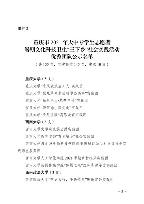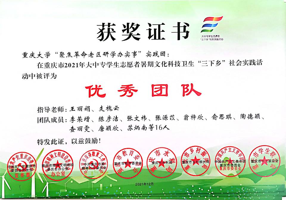 为响应国家对大学生“三下乡”社会实践活动的号召,秉持学院十多年来坚持开展暑期社会实践活动的初衷,2021年暑假,学院“聚焦革命老区研学办实事”实践团踏上征程,并获得“重庆市2021年大中专学生志愿者暑期文化科技卫生‘三下乡’社会实践活动优秀团队”荣誉称号和“电影天堂