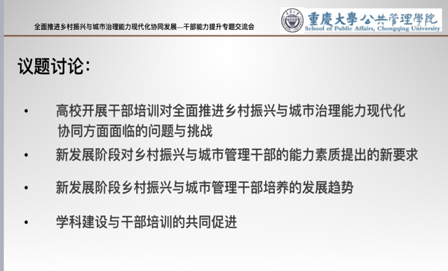 于2022年4月29日在学院举办了以“全面推进乡村振兴与城市治理能力现代化协同发展—干部能力提升专题”为主题的研讨交流会。