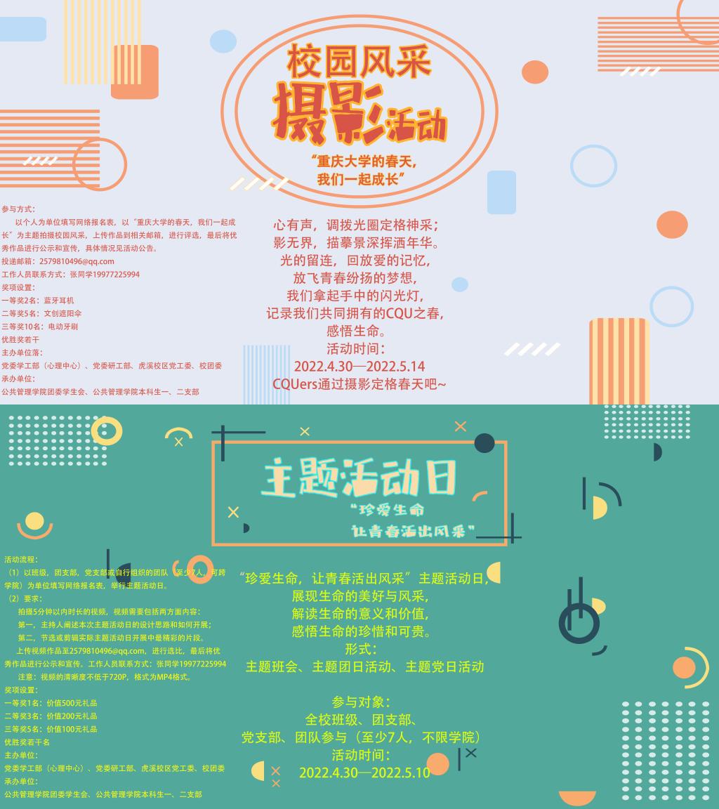 本次“珍爱生命,让青春活出风采”生命教育系列活动除了T恤绘画活动之外,还有主题活动日评选和校园风采摄影两个活动也在紧锣密鼓的开展中。其中主题活动日评选鼓励同学们召开一次以“珍爱生命,让青春活出风采”为主题的班会、团日活动、主党日活动或其他形式的活动日,拍摄视频片段参加评选和展示;校园风采摄影活动是在全校范围内收集以“电影天堂