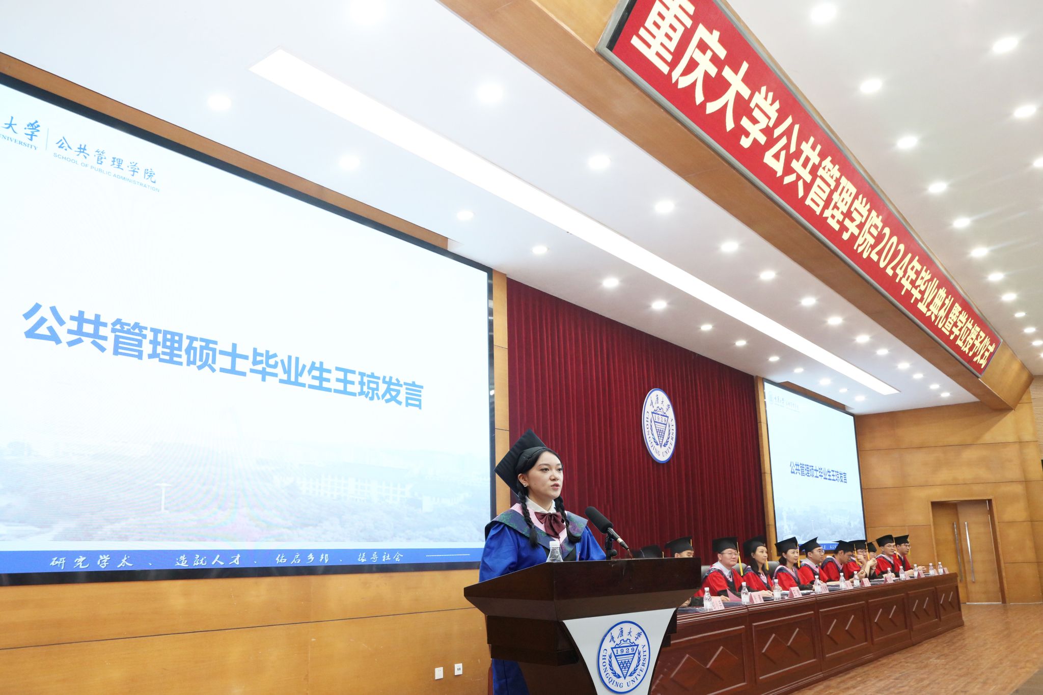 学术学位硕士毕业生代表王琼发言,她回顾过去的日子感慨万分并满怀憧憬。她向母校及学院致以最诚挚的谢意。她希望各位同学牢记“耐劳苦,尚简朴,勤学业,爱国家”的校训,胸怀远志、手握蓝图,昂扬思想、踏实脚步,让“尚道至公,管泽天下”的精神成为重大公管人闪耀的光环。