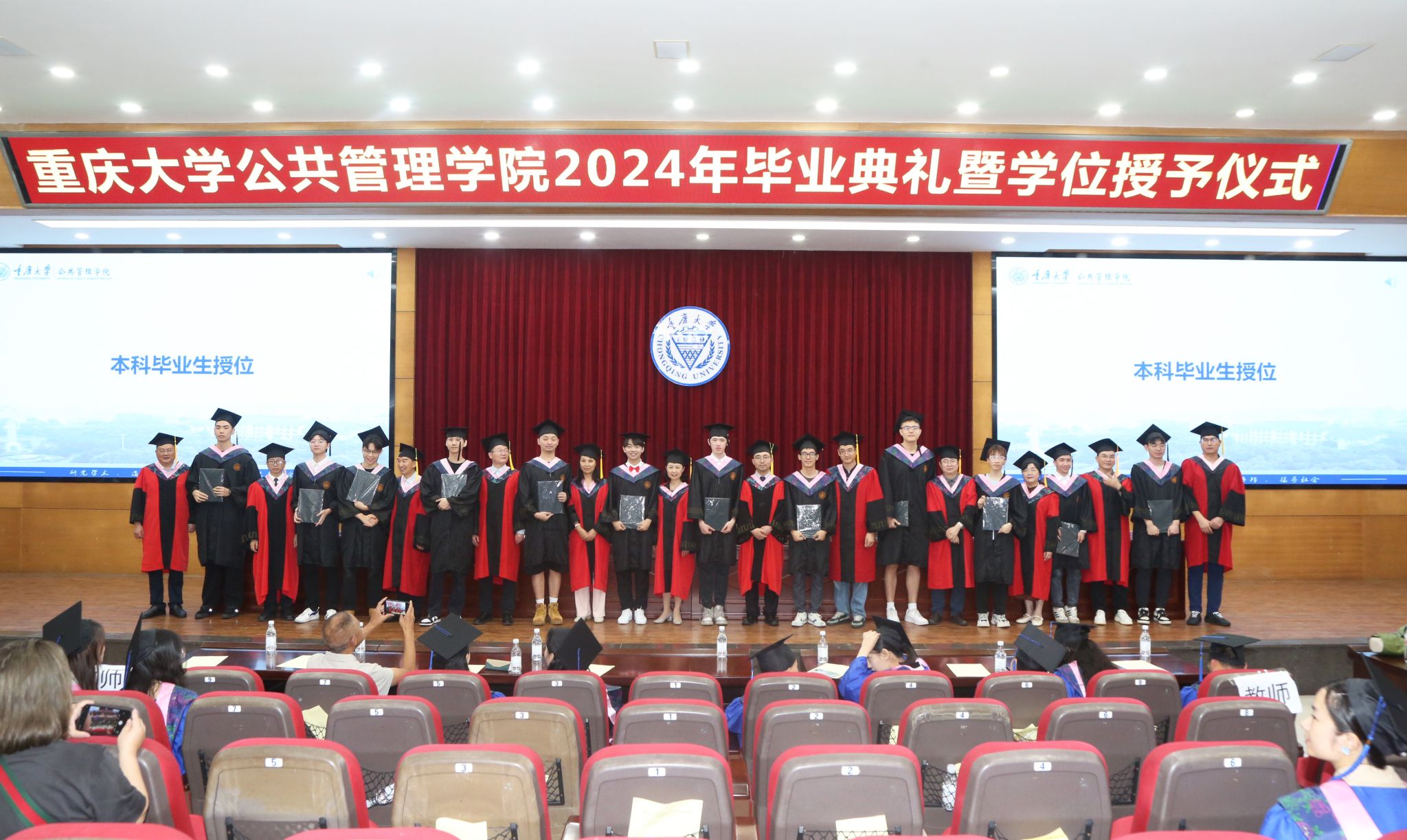 学位评定分委员会主席刘渝琳宣读学位授予决定,全场共同鼓掌祝贺449名获得学位、顺利毕业的同学。