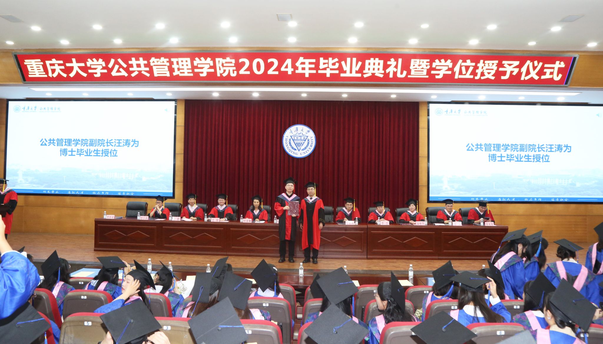 在授予学位环节,全体毕业生依次上台接受授位。这一刻,他们的脸上洋溢着自豪和喜悦的笑容,也充满了对未来的憧憬和期待。学院领导、导师代表为毕业生们拨穗正冠,毕业生们鞠躬致谢,合影留念,共同记录下这一难忘的时刻。