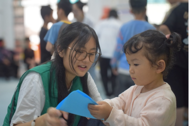 在“理想纸飞机”关卡,小朋友采用绘画或书写的形式写下自己心中的梦想,并折成纸飞机进行放飞。“乒乓球互动”关卡则让小朋友用筷子夹着乒乓球完成传递,锻炼了小朋友的手眼协调能力与团队配合意识。游戏环节结束后,小朋友兑换领取了笔记本、明信片、手环等重大校园文创文具。