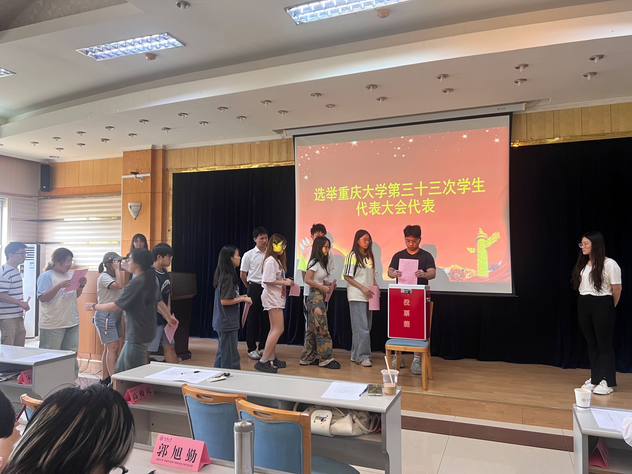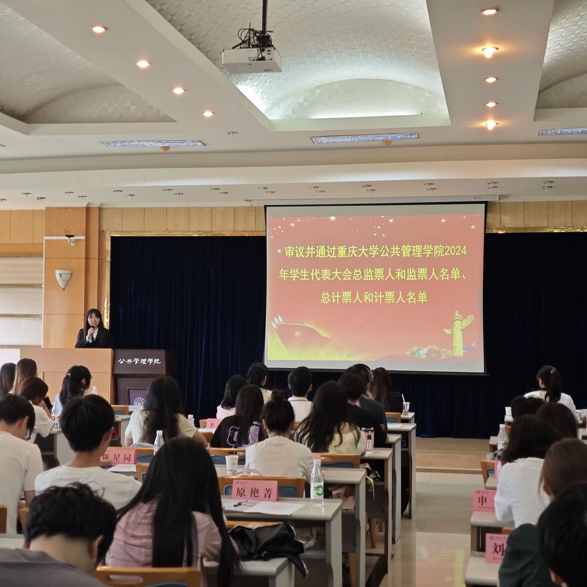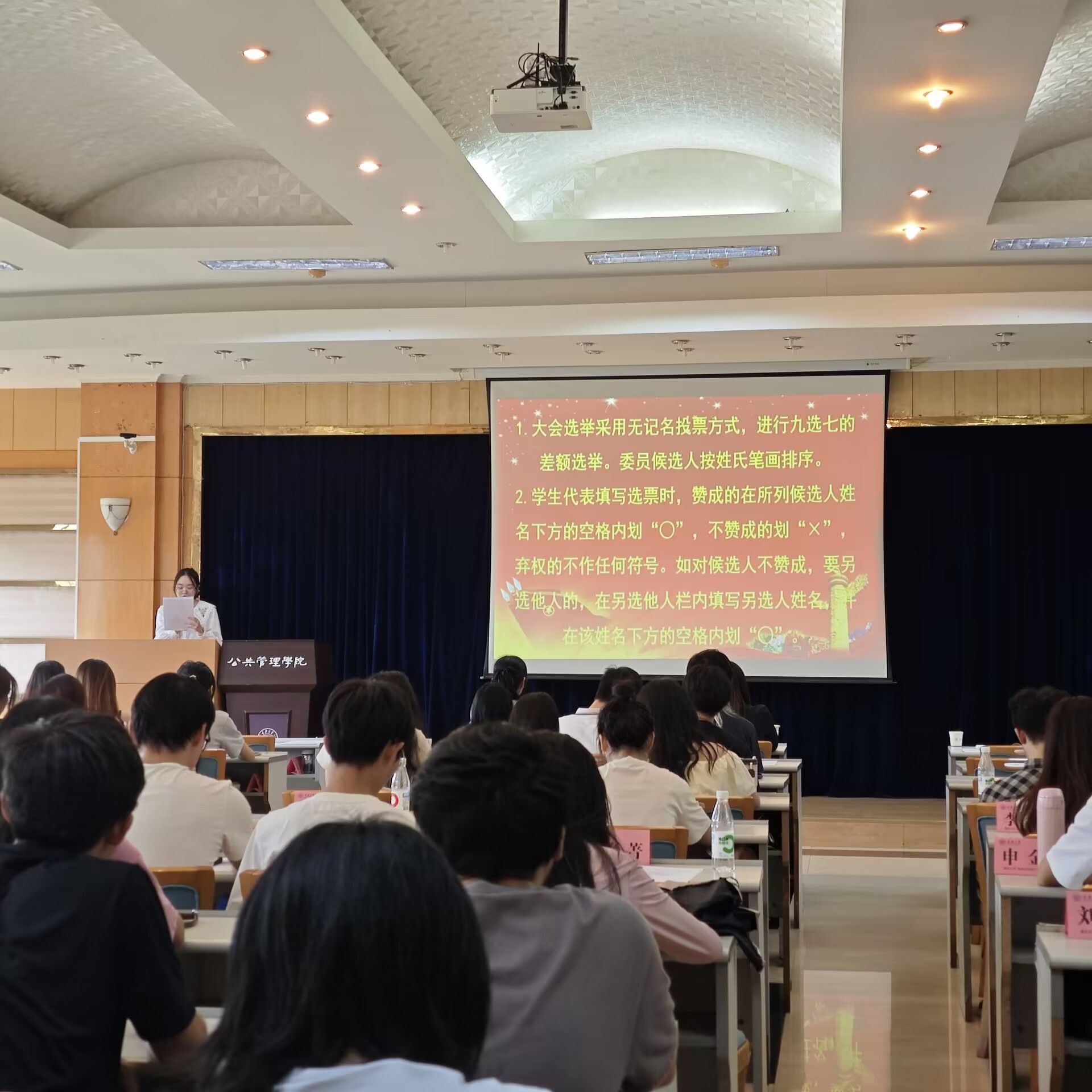 2024年学生代表大会候选人名单、学生代表大会选举办法,总监票人和监票人名单、总计票人和计票人名单。按照校团委、学生会文件要求,本次选举采用无记名投票方式,按不少于应选代表名额20%的差额形式进行差额选举,每位代表将从9位候选人中选出7位学生代表大会委员。在详细阅读候选人介绍、进行慎重考虑后,全体与会学生代表怀着庄严的态度投出了自己的选票。