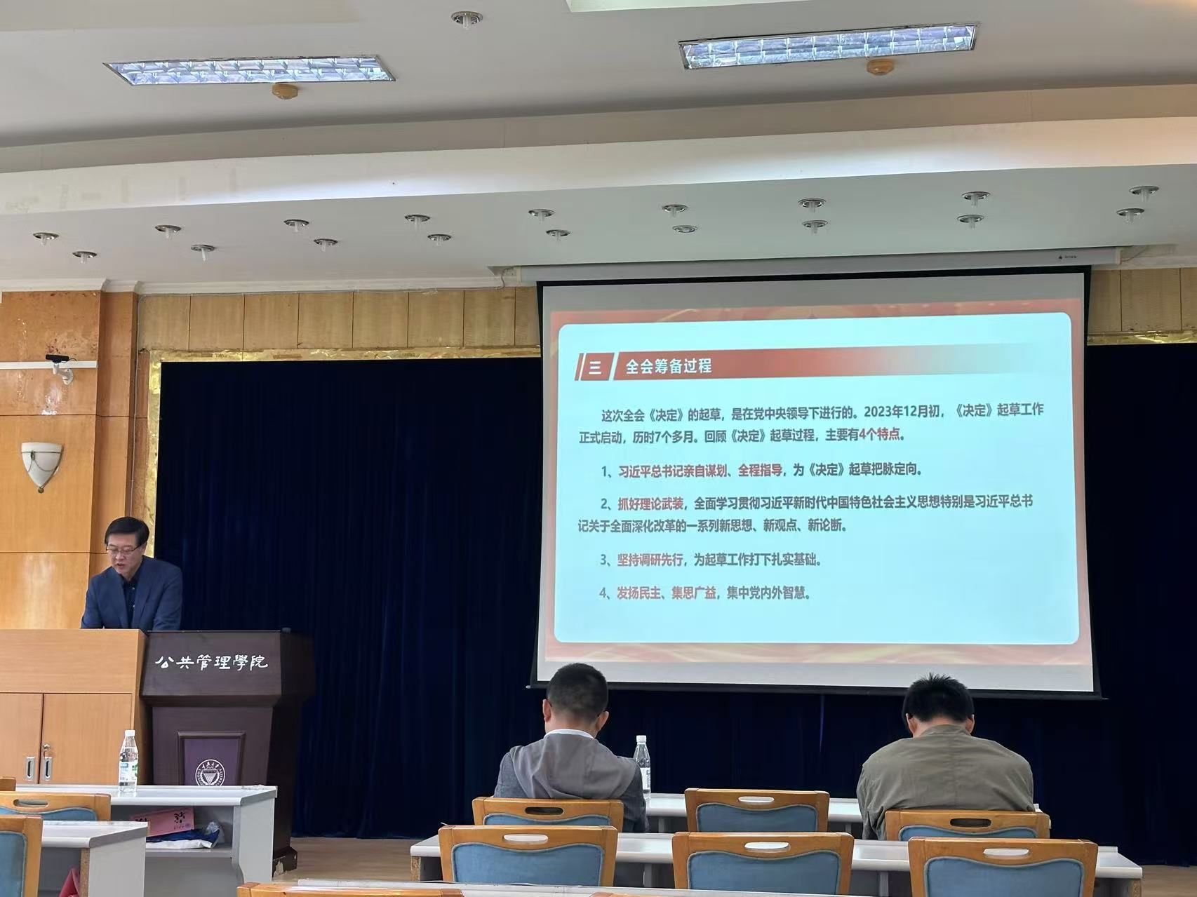 2024年10月24日下午,公共管理学院党委在学院202多功能厅召开学习贯彻党的二十届三中全会精神宣讲报告会。学院党委书记陈东作宣讲报告,学院全体教职工参加报告会。