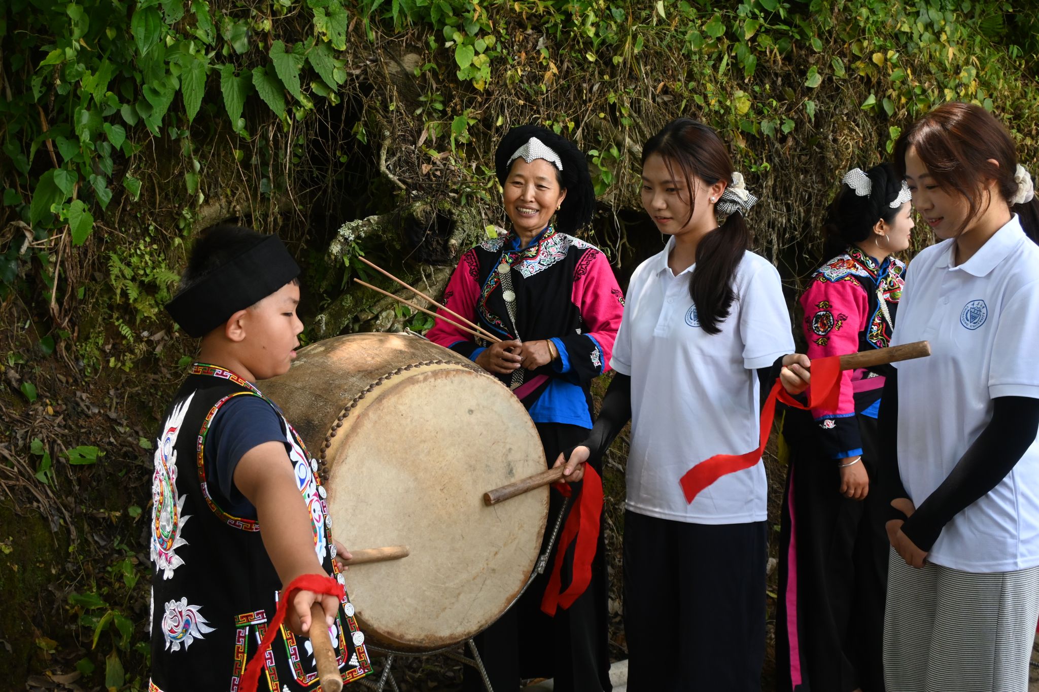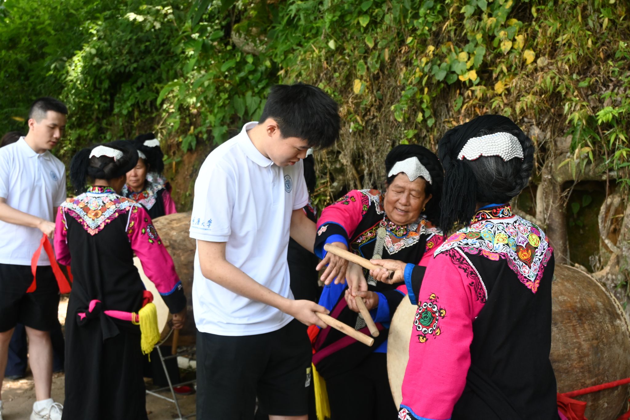 鼓声响起,热情的彝族同胞邀请服务团成员学习传统舞蹈“跳鼓舞”。成员们在村民带领下,挥动鼓槌,踏着节奏起舞,现场欢声笑语不断,民族团结的氛围在舞步与鼓点中愈发浓厚。跳鼓舞不仅是一种舞蹈形式,更是一种文化符号,它承载着彝族人民的历史记忆和民族精神,也在潜移默化中加深了成员们对民族文化的理解与认同。