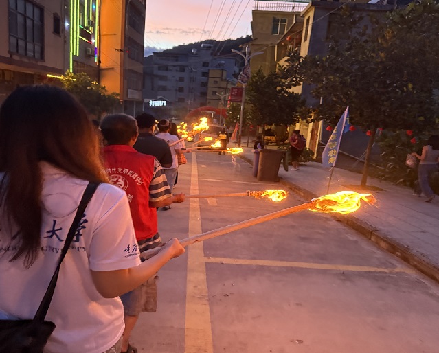 图为服务团师生手持火把参与巡游队伍