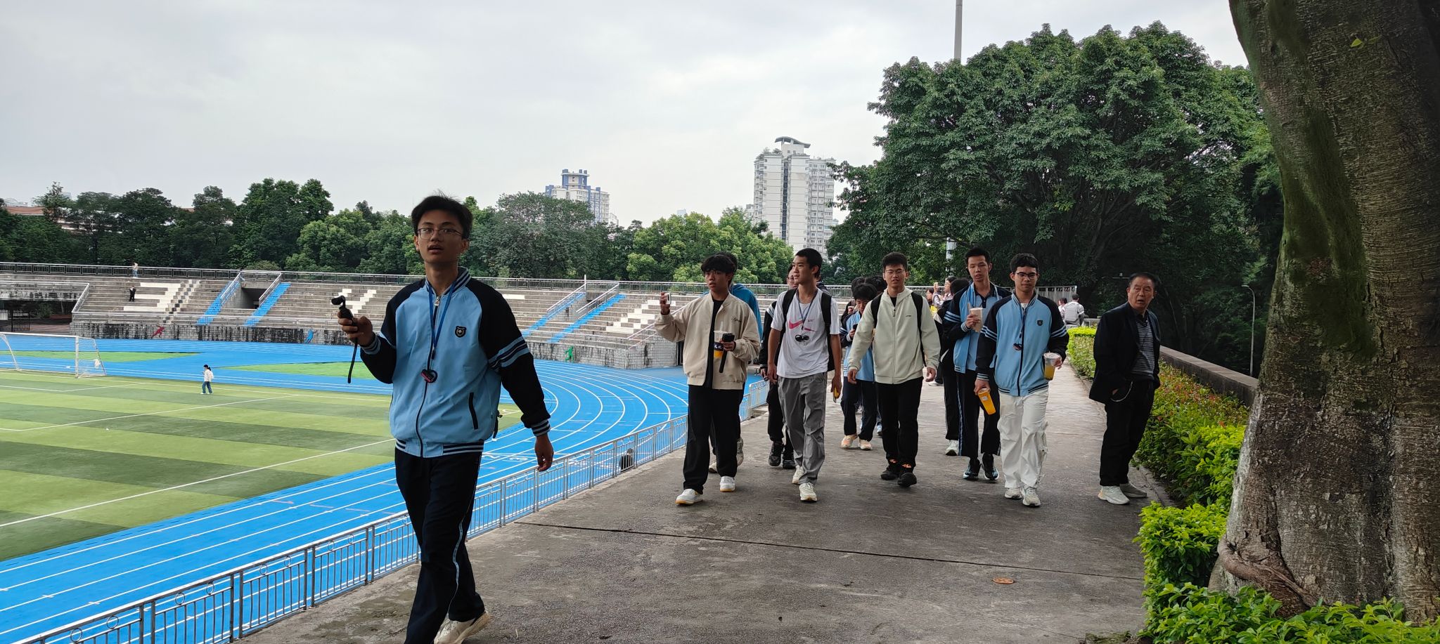 A区钟塔拉开序幕。南宁三中的师生们抵达后,迅速分配小组带领对应的班级。活动伊始,王丽娟同志及一、四支部的成员们为远道而来的南宁三中研学团队表达了热烈而真挚的欢迎之情,并介绍了活动的流程:校园参观、集体合影、参观深空探测联合研究中心及食堂共进午餐。