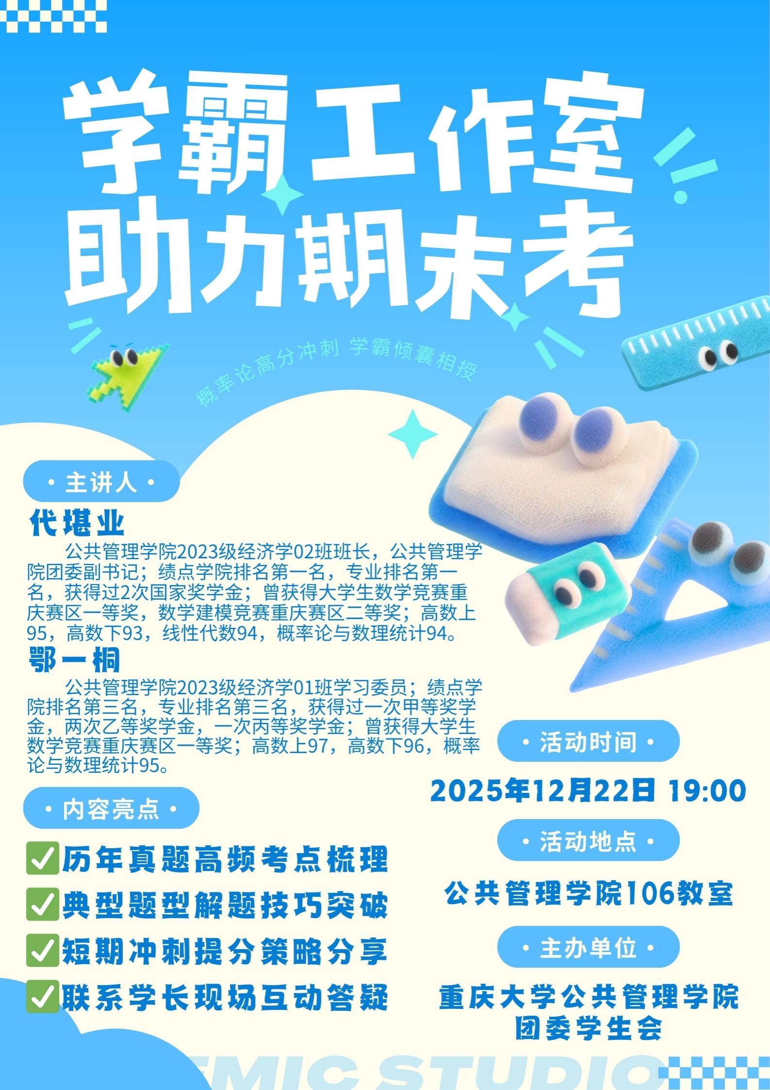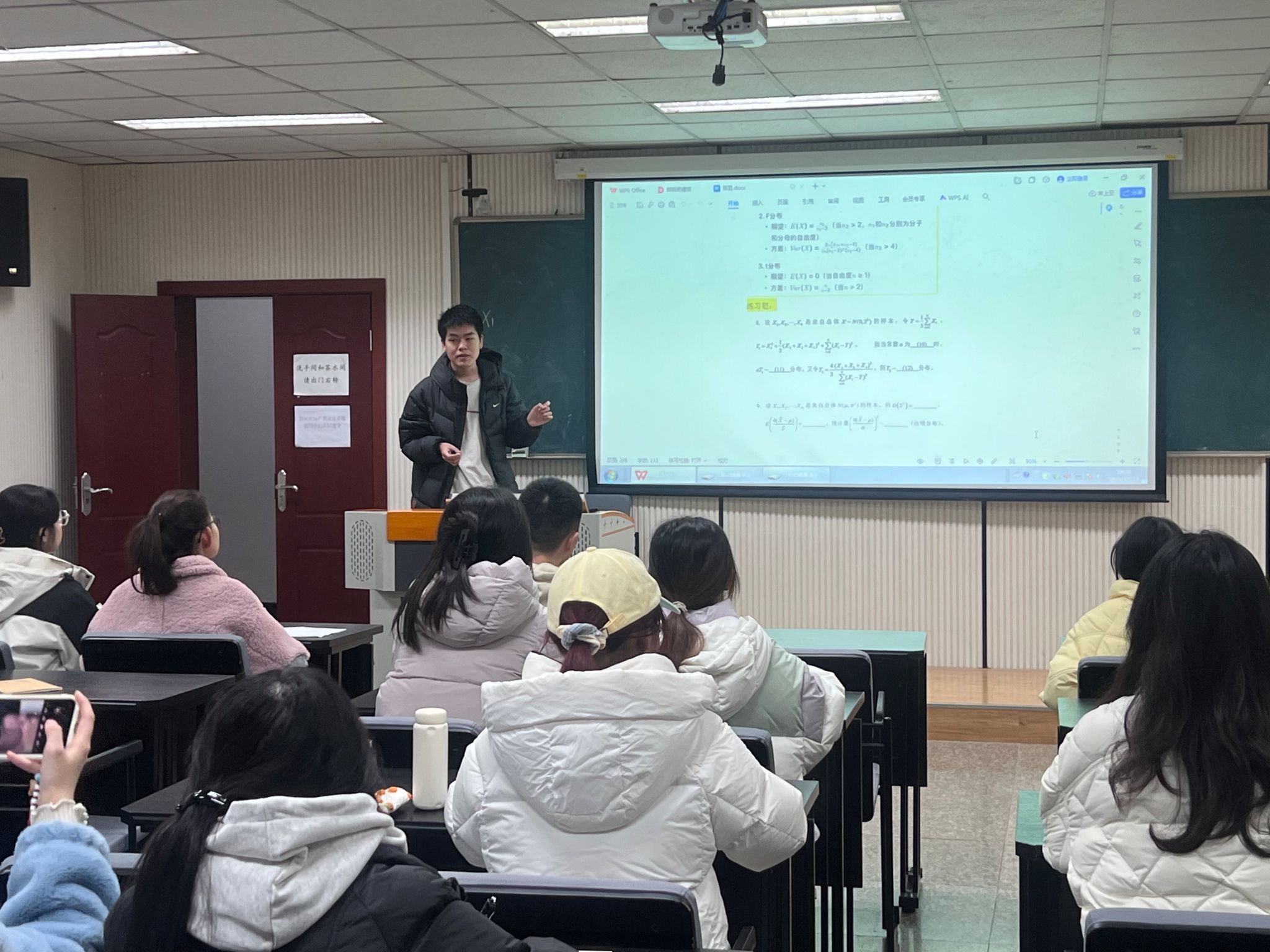 本科团委学生会于学院106教室成功举办“学霸工作室,助力期末考”《概率论与数理统计》高分冲刺分享会。活动由学院团委书记、24级辅导员徐柳老师主持,邀请到学院2023 级本科优秀学子代堪业、鄂一桐学长担任主讲人,为24级50余名学弟学妹们带来干货满满的分题型备考指导。