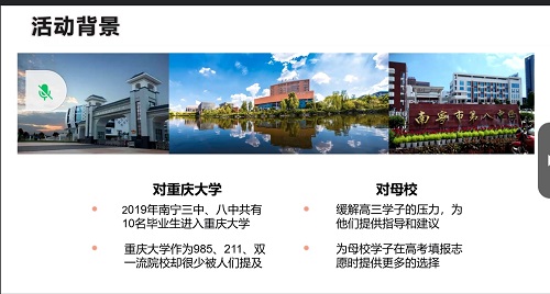 的了解中也体会到了身为学长学姐的自豪感。另一支队伍平南县中学则极具创新能力。他们在宣讲过程中突破了传统的宣讲方式,以讲故事的形式向学弟学妹们分享他们在重大的有趣经历和丰富生活,极大的激发了学弟学妹们对重大的兴趣。在反思中,他们总结道,由于队伍成员都是第一次参加宣讲活动,因此有些经验不足,在介绍专业时也因准备工作不足而没有表现好,但是有了这次的经验,他们会在明年的宣讲中做的更加优秀。