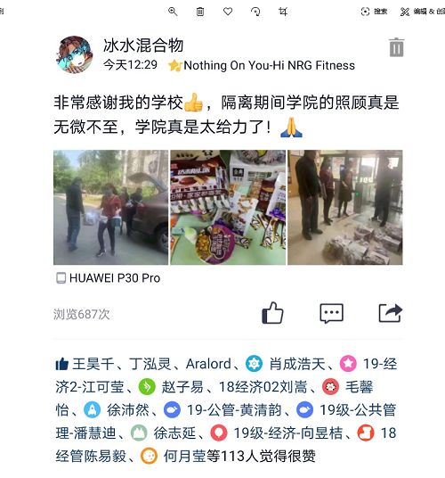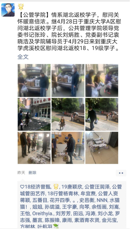 湖北返校学子们对学院的这种“家人式”的关爱表示感谢,有同学通过发朋友圈的方式感慨道:“返校过后,学院的一切安排都很周到。学院领导老师们很体贴、很温暖,疫情期间,仍然带着丰厚的礼品前来慰问。时刻牵挂着我们,关心着我们,真的非常感谢公管学院这个温暖的大家庭!”字里行间流露出暖心的感动。也有同学说道:“感谢辅导员老师忙前忙后地为我们操劳,替我们解决返校生活中的各种问题,老师辛苦了!”