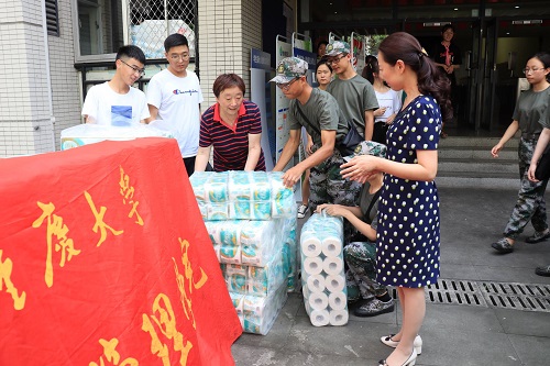 为进一步了解19级新生的来校及军训情况,传递浓浓真情关怀,2019年9月11日下午1时,学院党委书记张玲、学办主任兼18、19级辅导员王丽娟、辅导员助理谢镇江于虎溪校区松园4栋楼下对19级军训的新生进行了慰问与深入交流。18级班团委的同学们到场协助分发慰问品。
