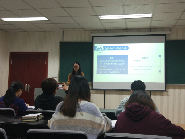 比赛伊始,何薇简要介绍了比赛的基本情况。比赛正式开始后,参赛同学按照顺序一一上台进行个人职业生涯规划展示。本次参赛同学覆盖了研究生和本科生的不同年级,8名同学通过精心制作的ppt依次作了精彩展示。大家从个人介绍、职业分析、职业定位、计划实施和评估修正等几个方面展开自我剖析,综合运用霍兰德职业兴趣测评、MBTI职业性格测试、WVI职业价值观测试和职业锚测试等多种方法,尽力做到有理有据,切实可行。大家从不同角度、不同方式展现自己对未来的期待和梦想,有的立志成为一名人力资源总监、有的则想成为公办养老机构负责人,从提升自己到服务社会,大家的理想丰富多元。