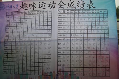 据悉,此次虎溪校区秋季趣味运动会的比赛项目由集体跳绳、趾压板接力、山不转水转、战车履带、绳鼓颠球、摸石头过河、多人多足50m跑、花式越野、拔河以及20×50接力共十个项目组成。其中学院在集体跳绳、趾压板接力、山不转水转、战车履带、绳鼓颠球、摸石头过河、多人多足50m跑、拔河八个项目中获得第一,在花式越野、接力赛中获得第二,创造出总成绩第一的好成绩,连续多年获得此项荣誉。