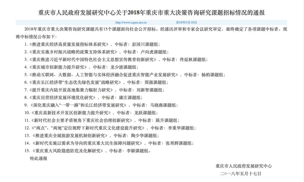 2018年5月17日,重庆市人民政府发展研究中心在其官网 主页