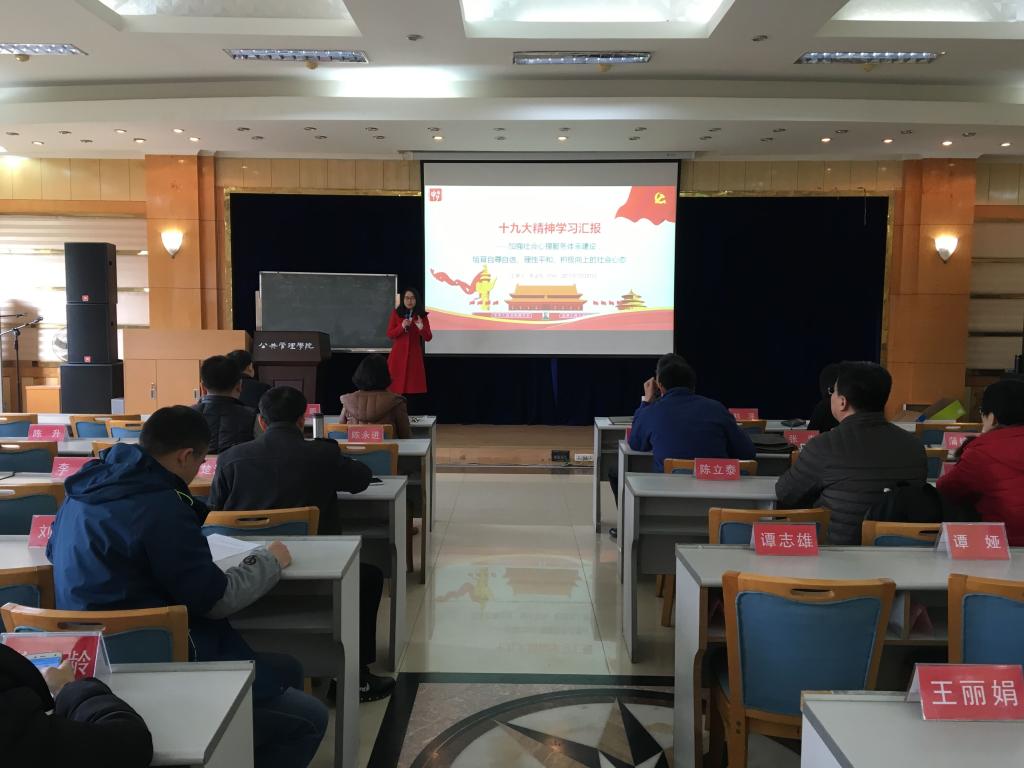 党委组织学院全体教师在多功能厅进行专题学习,深入学习党的十九大报告。本次学习由学院党委书记兼常务副院长张邦辉主持,由社会工作系张金凤老师主讲。