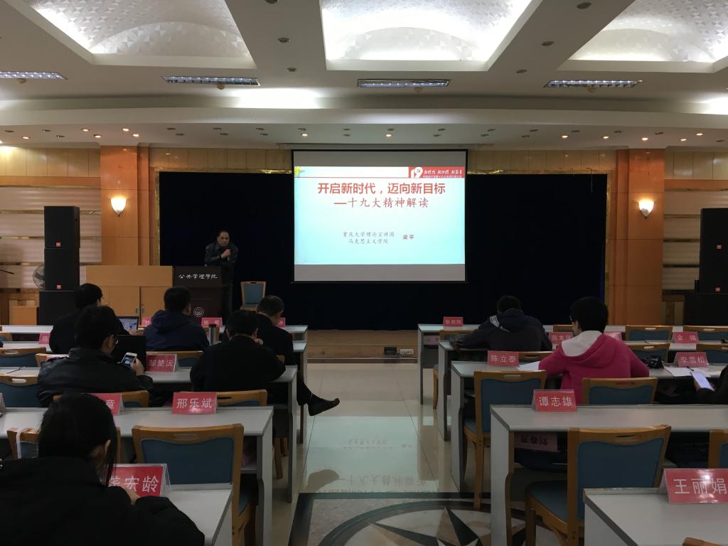 2017年11月23日下午3点,公管学院党委在二楼多功能厅举行了党的十九大精神学习宣讲,邀请了马克思主义学院梁平教授作宣讲嘉宾。学院全体教师参加了此次宣讲。