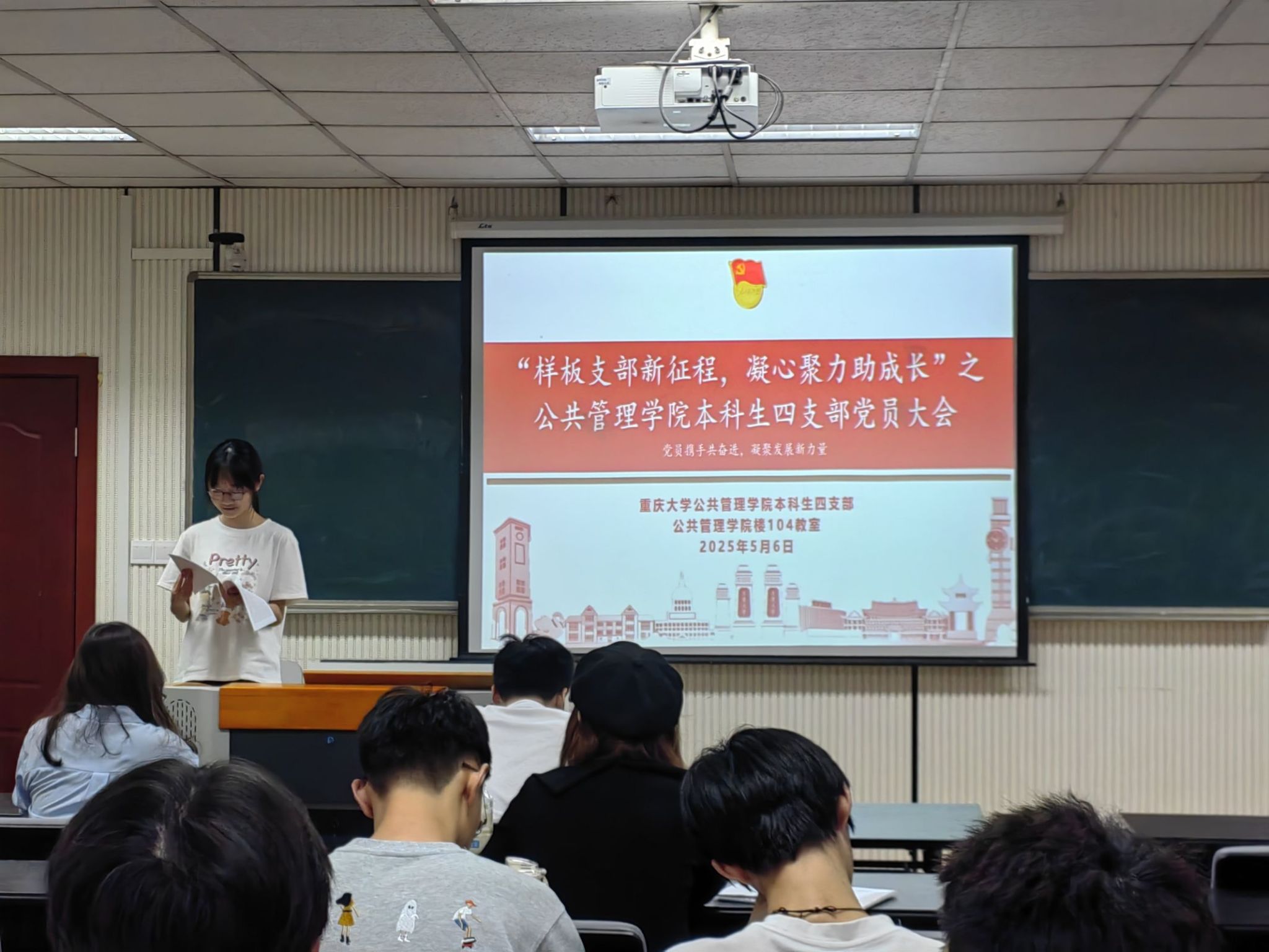 本科生四支部于学院楼104教室召开党员大会,分三批讨论决定了王艺瑾同志等8名发展对象的预备党员接收事宜。参会成员有四支部书记钱诗佳同志、组织委员申徽同志、宣传委员付薇同志以及本科生四支部全体预备党员。