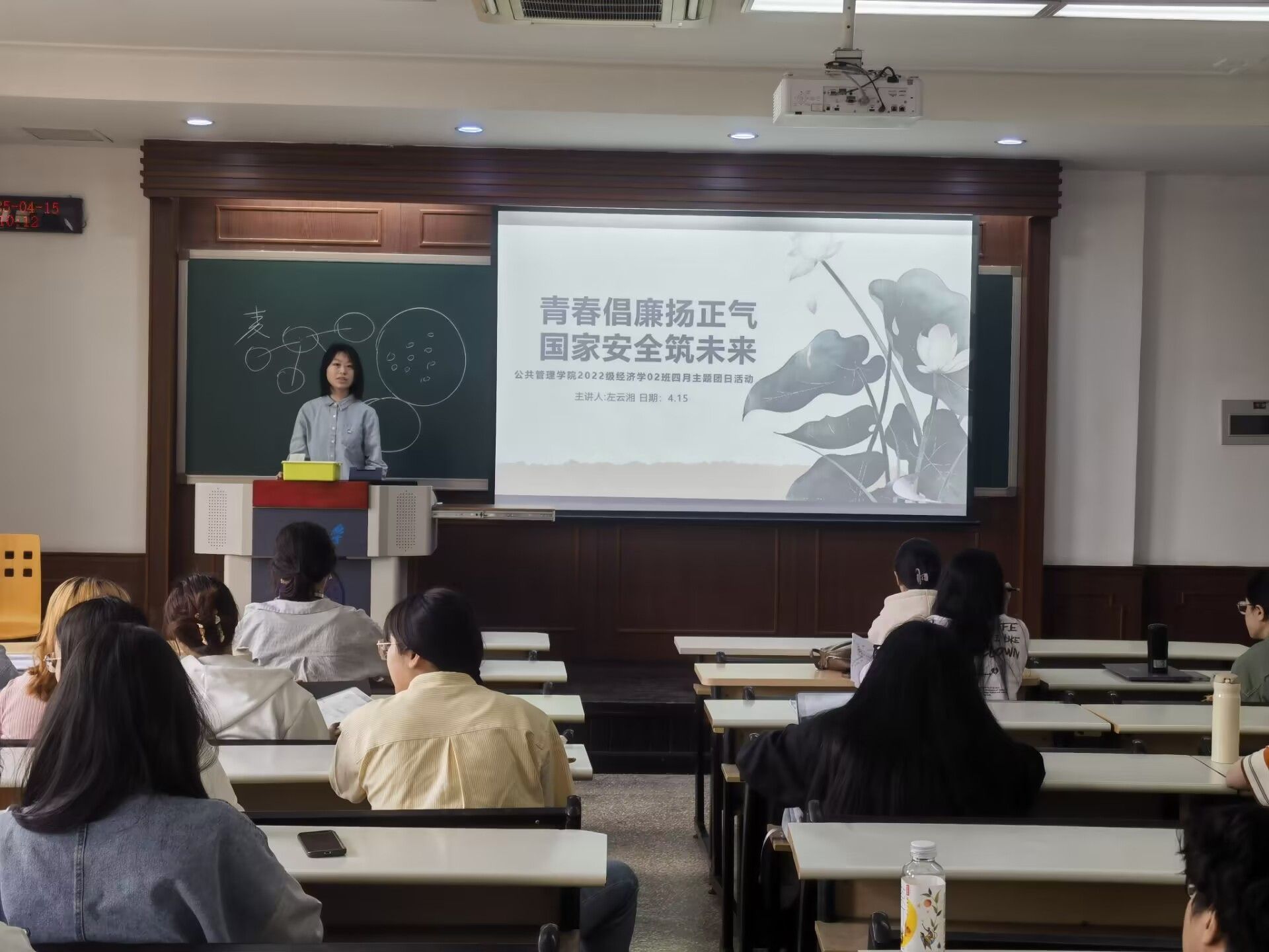 活动在经济学02班团支书左云湘的开场中拉开帷幕。她首先向同学们详细讲解了贯彻廉洁文化的相关内容,通过解读习近平总书记的讲话精神,使大家深刻认识到廉洁文化的重要性。左云湘强调,新时代青年要坚定理想信念,增强廉洁意识,践行廉洁文化,从自身做起,树立清正廉洁的价值观。