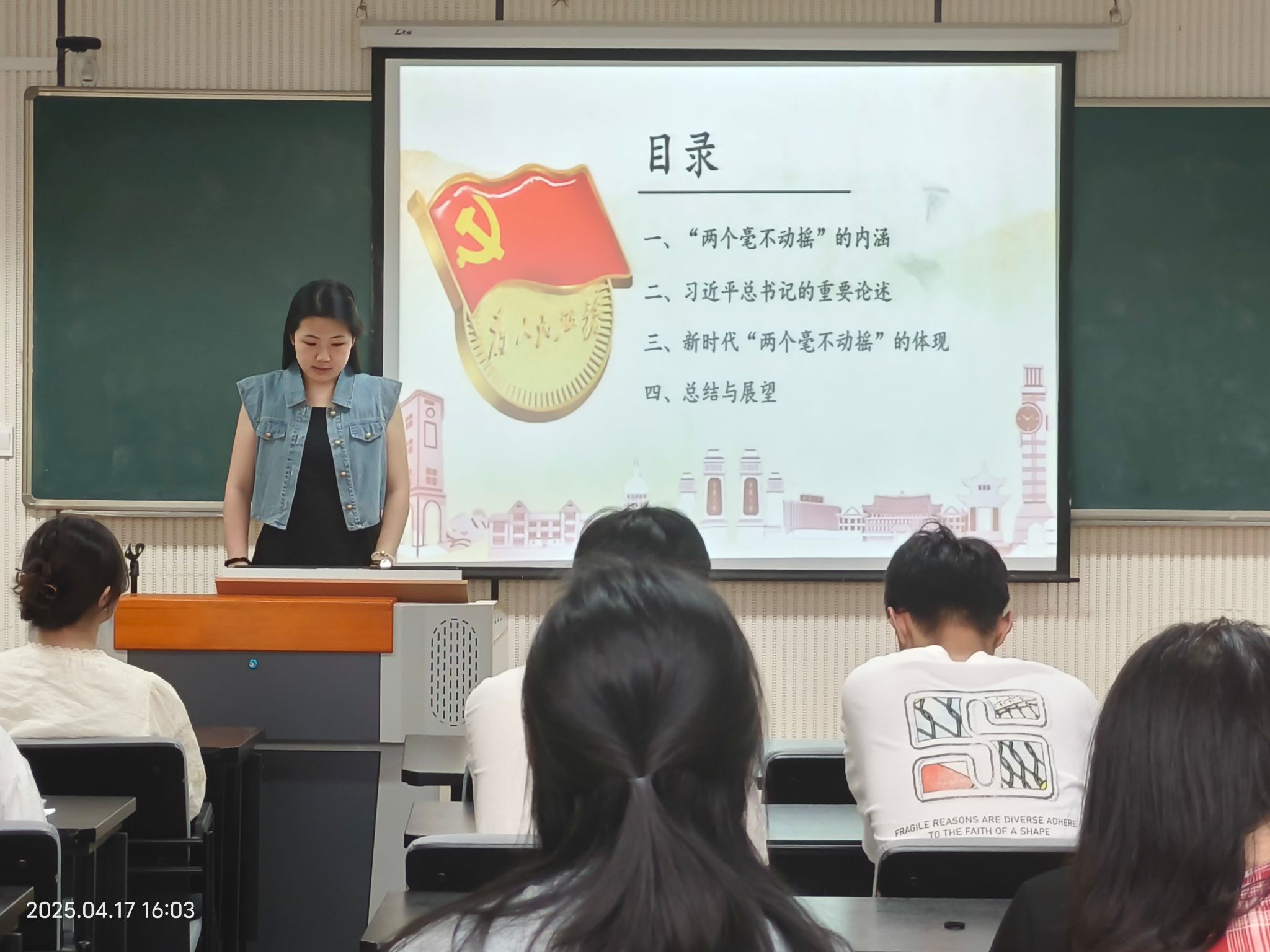 本科生一、四支部在学院楼106教室成功举办“样板支部新征程,凝心聚力助成长”之坚持和落实“两个毫不动摇”主题学习活动,本次活动由一支部书记王丽娟组织进行,全体党员、预备党员积极参与。
