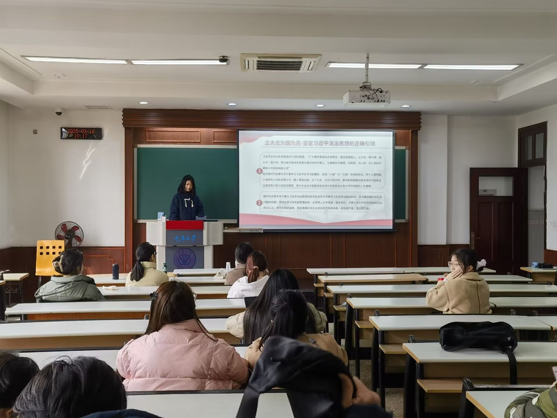 活动伊始,班级团支部书记左云湘首先向同学们详细讲解了民主法治的相关内容。通过讲解习近平总书记在清华大学等地方的讲话,同学们对民主法治有了更加清晰的认识,更加坚定了跟党走的决心和信心。然后,团支书从讲话内容向外延申,希望同学们能够立大志,明大德,担大任,以习近平法治思想作为开展学习和实践创新的航标,作为解决理论和实务问题的利器,把理论学习和实践贯通起来,从思想上正本清源、固本培元。在讲解过程中,同学们认真倾听,专心学习,积极互动,踊跃发言,现场氛围浓厚。