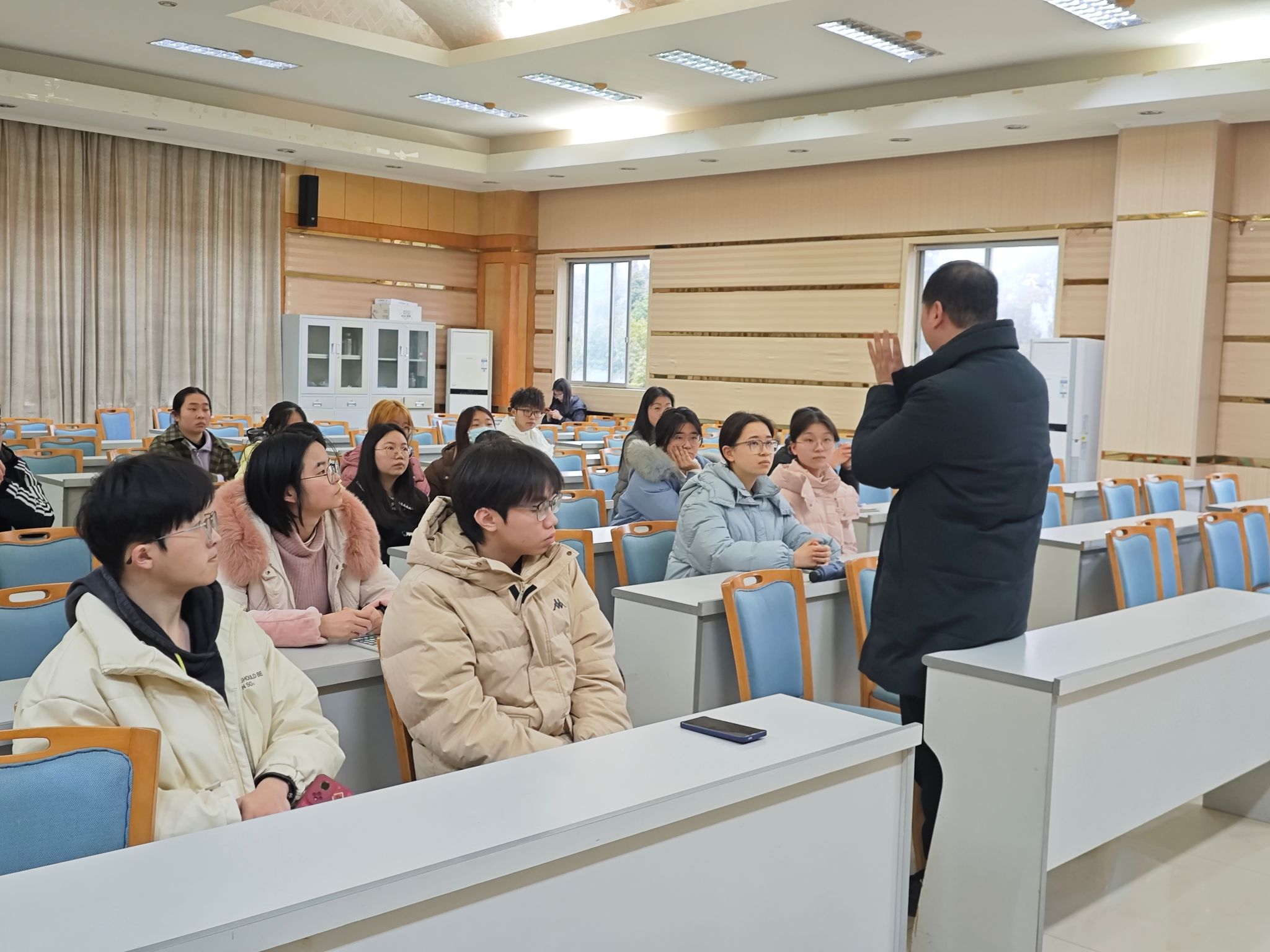 紧接着,周洲老师就毕业就业,攻读研究生,出国深造等方向,结合往届优秀毕业生范例进行全面细致的讲解。他指出,学生应该积极与老师保持密切联系,明晰自己的未来发展方向,遇到有困惑的地方及时向老师求助,解决困难。只有这样,才能高效率地完成自己的职业生涯规划这一人生课题,不再迷茫无助,更好地保持高效健康的学习与生活状态。