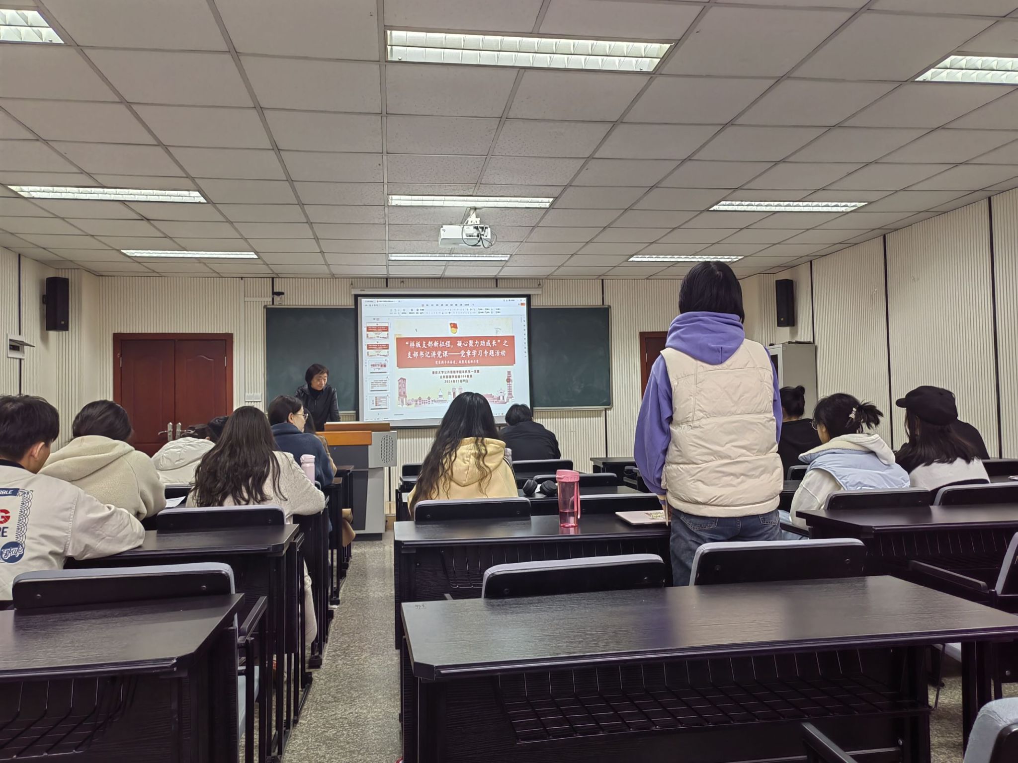 2024年11月28日13:00,为深入推进学习贯彻党的创新理论,特别是党的二十大精神,增强全体党员对党章的理解和认同,学院本科生一支部于学院楼104教室成功举行了“样板支部新征程,凝心聚力助成长”之支部书记讲党课之党章学习活动。此次活动由本科生一支部书记王丽娟主讲,本科生一支部全体党员、预备党员积极参与。
