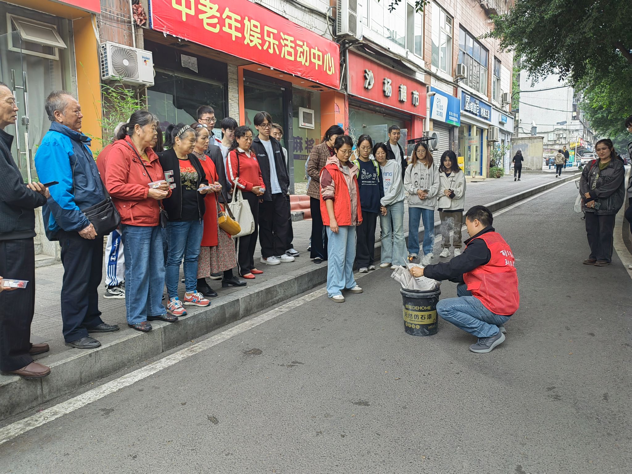 在完成石膏娃娃上色后,同学们和社区工作人员共同组织老人们在室外参与观看了灭火器的使用讲解和演示,为火灾发生后的安全灭火做出了预防,爷爷奶奶都观看的非常认真。