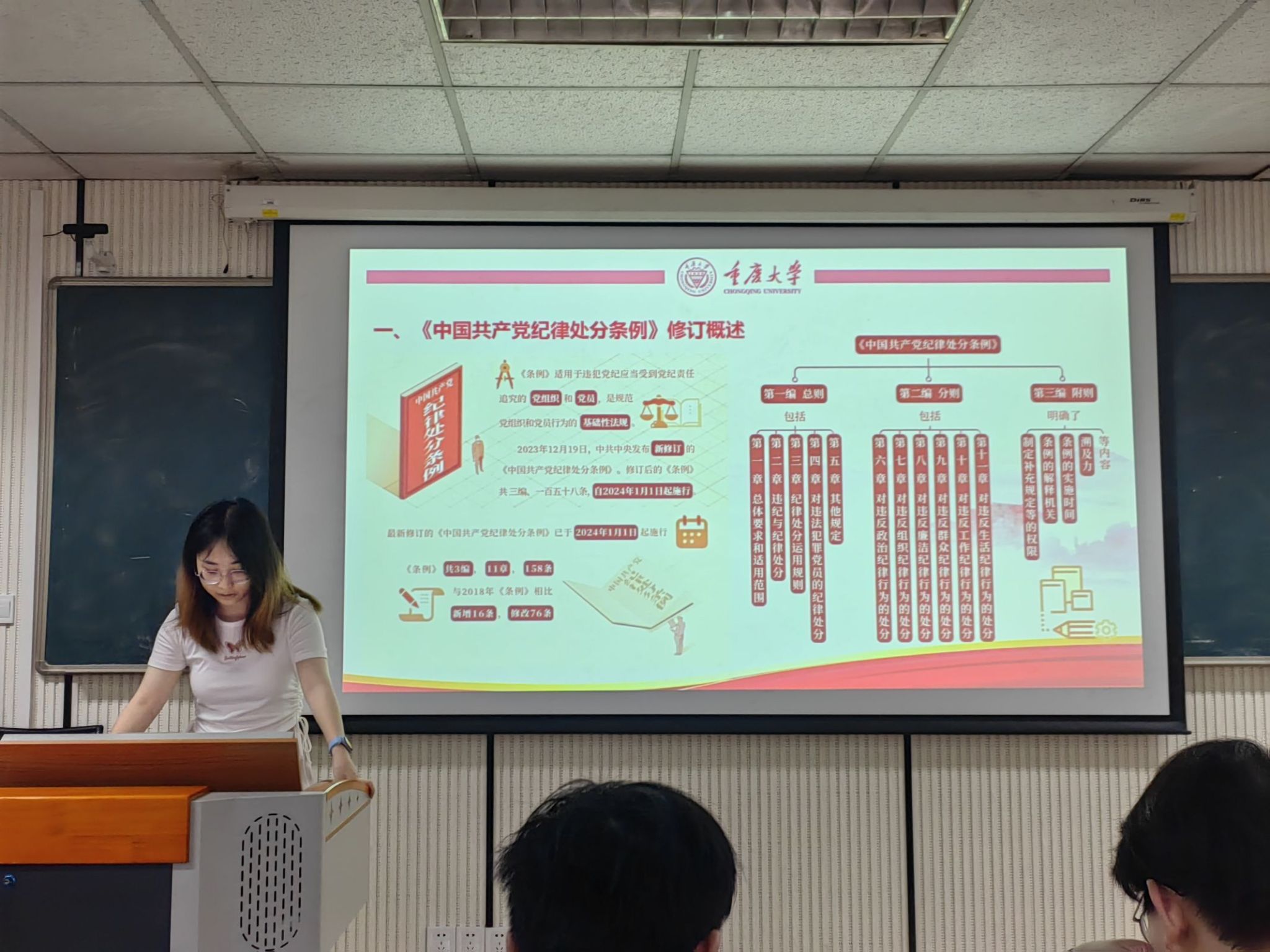在第三个环节,付薇同志为大家简要解读了新修订的《条例》内容。《条例》于2023年12月19日发布,24年1月1日起施行,共三编,11章,158条;第一编总则包括《条例》的适用范围,违纪的内涵,纪律处分的运用规则,和对已经违法犯罪的党员的纪律处分要求等;第二编分则是具体的纪律处分、违反处分规定,包括政治纪律、组织纪律、廉洁纪律、群众纪律、工作纪律和生活纪律;第三编是附则明确了其他内容。