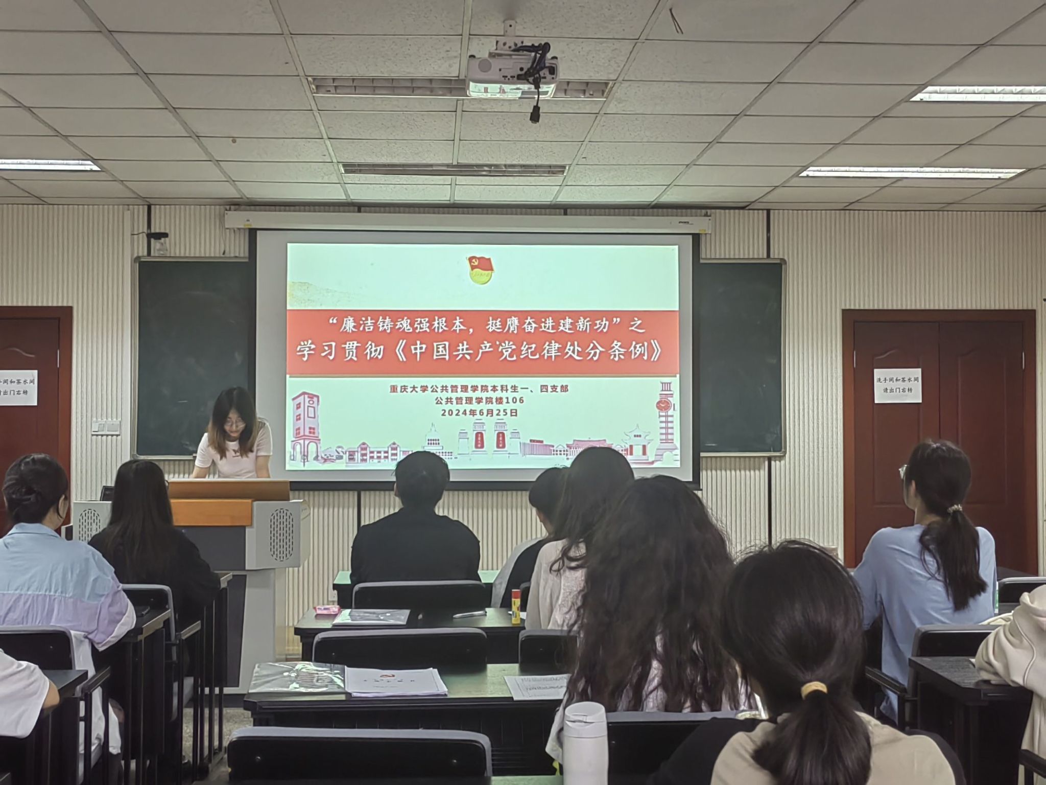 本科生一、四支部全体党员和入党积极分子们在学院楼106会议室积极参与了“廉洁铸魂强根本,挺膺奋进建新功”之学习贯彻《中国共产党纪律处分条例》主题活动。此次活动由本科生四支部宣传委员付薇主讲,从党纪修订背景、案例警告和新修订的《条例》内容三个环节展开学习。