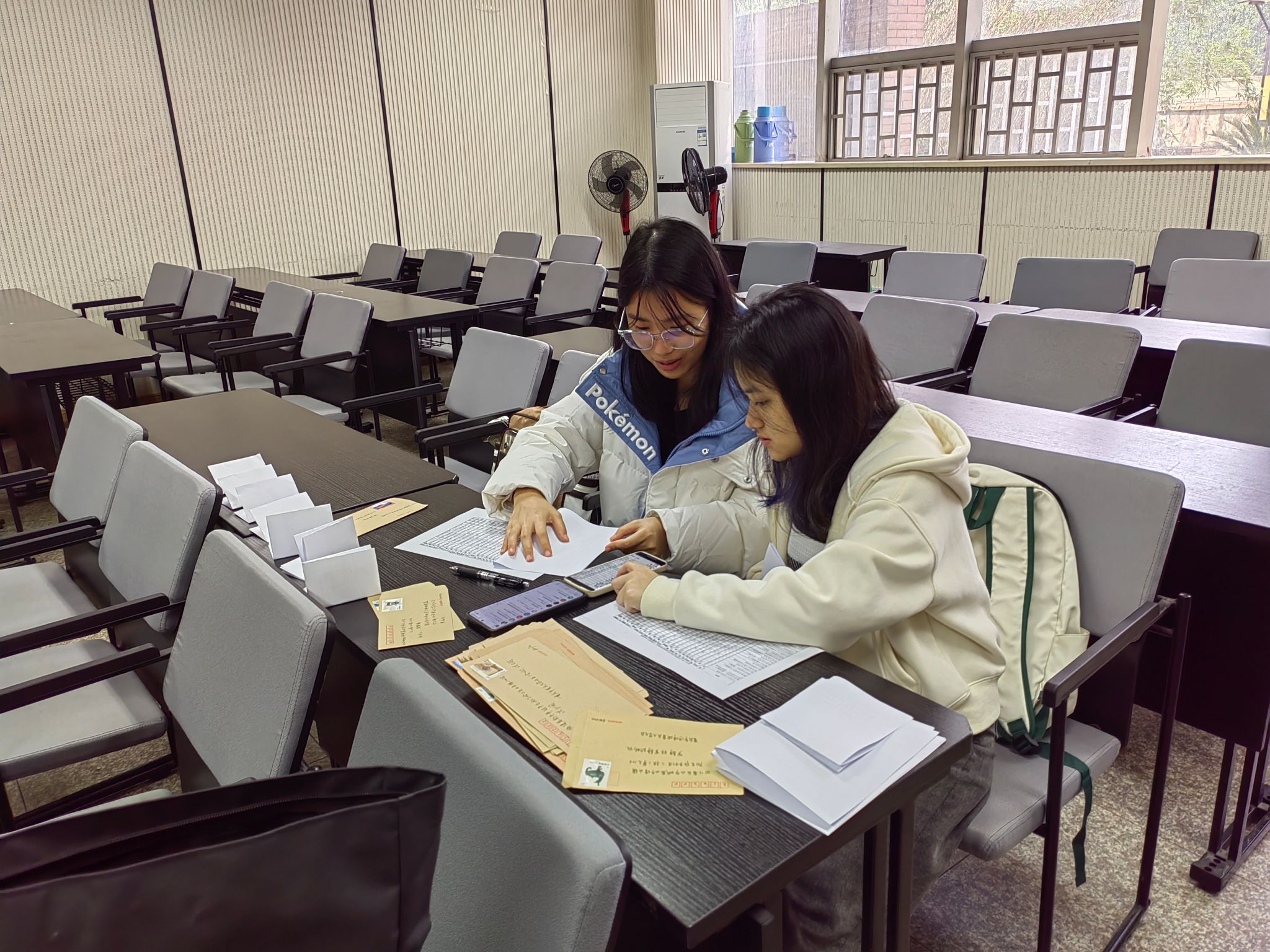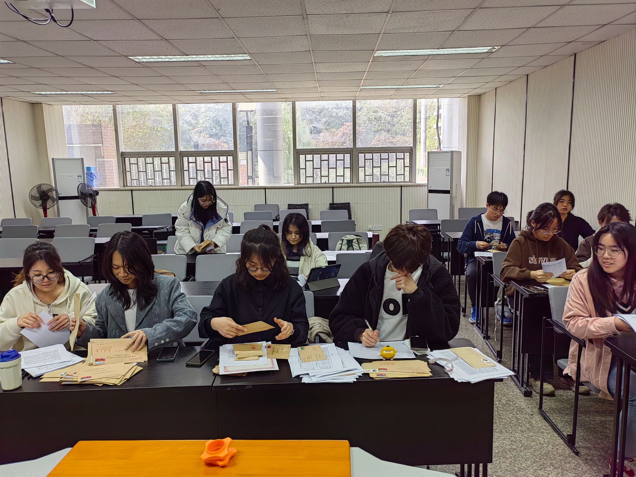 楼104教室,紧锣密鼓地展开《给家长的一封信》和成绩单的装配和密封工作。各位班干部分类整理、叠放本班文件,一一检查信封的书写、邮票的粘贴是否规范。合格的信封将进入资料分装密封环节,在确认信息无误后统一寄出。