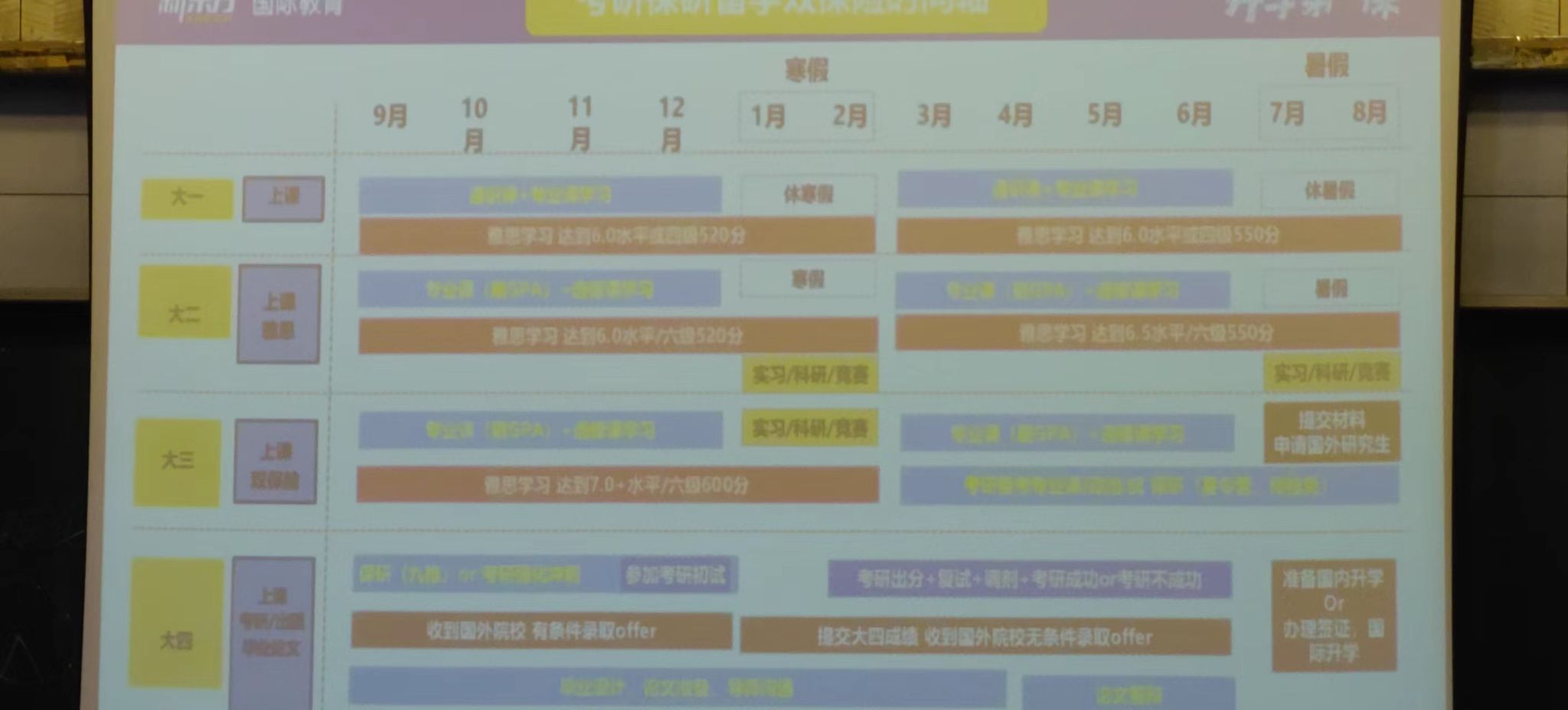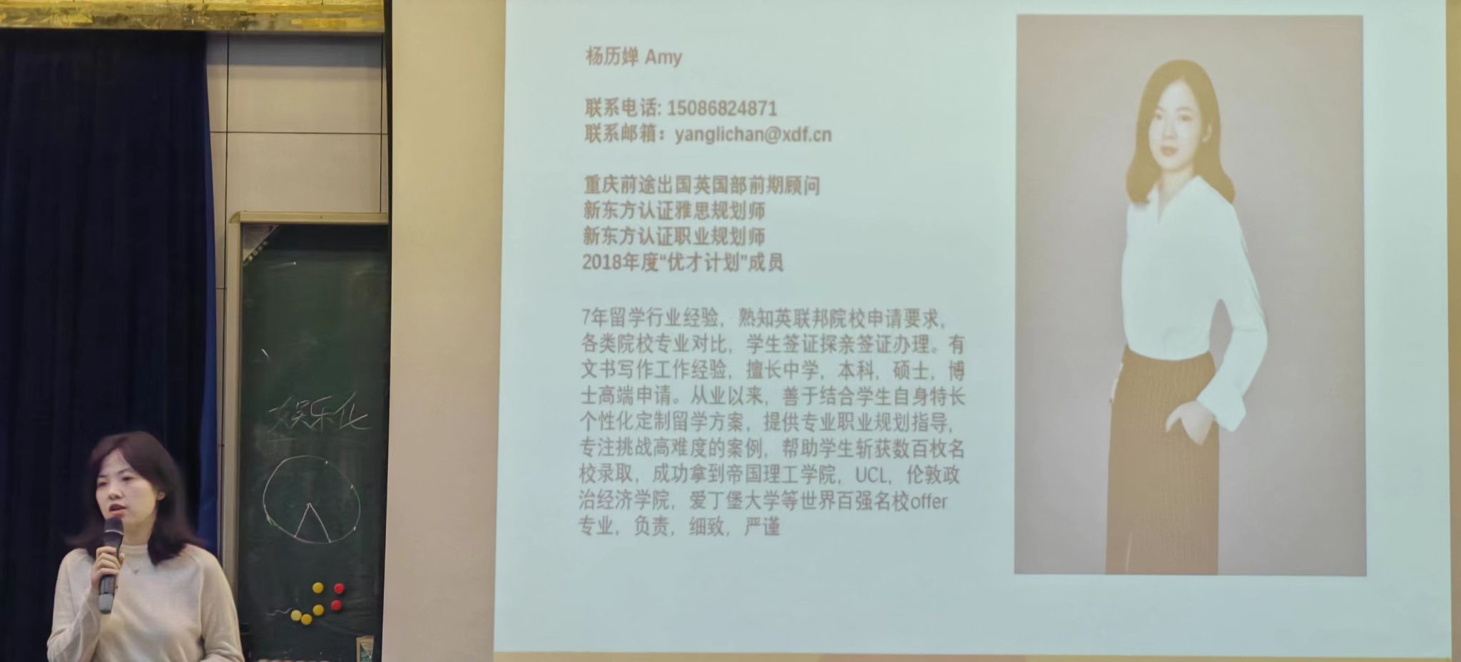 接着,由新东方培训机构的认证规划师杨历婵老师为同学们讲解近年来的升学情况、考研保研以及出国同学的占比,分析对于想要升学的同学考研保研出国三条道路的竞争压力,并着重根据以往成功案例介绍英国留学的相关情况。