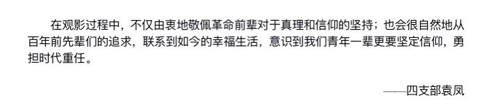 观影结束后,同志们感触颇丰。李雪莲同志表示:“《望道》不仅可以望到那个时代年轻人的热血沸腾与心潮澎湃,更让我们从影片中望到那真理与光明之道。”袁凤同志表示:“在观影过程中,不仅由衷地敬佩革命前辈对于真理和信仰的坚持;也会很自然地从百年前先辈们的追求,联系到如今的幸福生活,意识到我们青年一辈更要坚定信仰,勇担时代重任。”