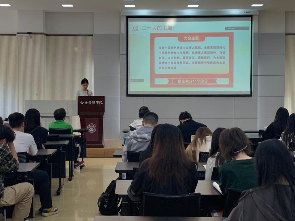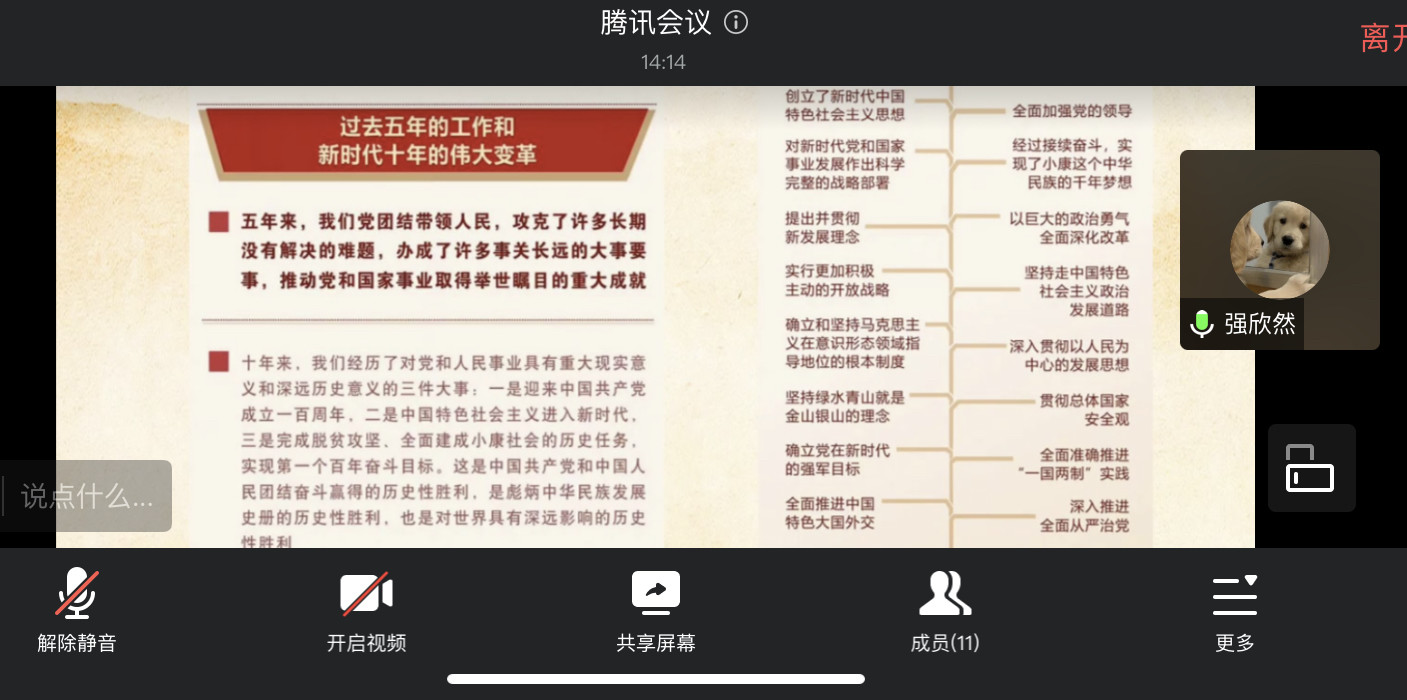 接着,主持人向昱桔为大家解读了本次大会内容,带领党员们全面把握新时代10年伟大变革的里程碑意义。本次报告包括发展全过程人民民主、坚持全面依法治国、推进文化自信自强、增进民生福祉等15个部分,明确宣示党在新征程上举什么旗、走什么路、以什么样的精神状态、朝着什么样的目标继续前进,对团结和激励全国各族人民为夺取中国特色社会主义新胜利而奋斗具有十分重大的意义。此外,中国的成功经验,可以为很多国家提供借鉴和启发,鼓励各国探索出一条符合自身实际的现代化发展道路。