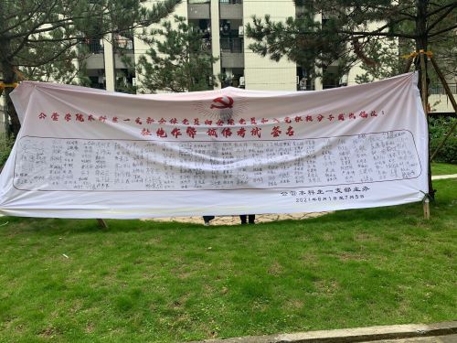 在线下,本科生一支部全体党员向公管学院党员及积极分子发出倡议,并准备了“杜绝作弊,诚信考试”签名墙,鼓励同学们在墙上签名,以坚定诚信考试的决心,做出诚信考试的承诺。签名墙将一直放置于松园四幢,供同学们签名以明志的同时,也起到了扩大宣传的作用。不多时,雪白的签名墙便被同学们的名字所填满,透过苍劲有力的笔迹,我们充分体会到了同学们签名时的果断和决心,最后统计结果19.20级两个年级有340余名同学在签名墙上签上了自己的名字。