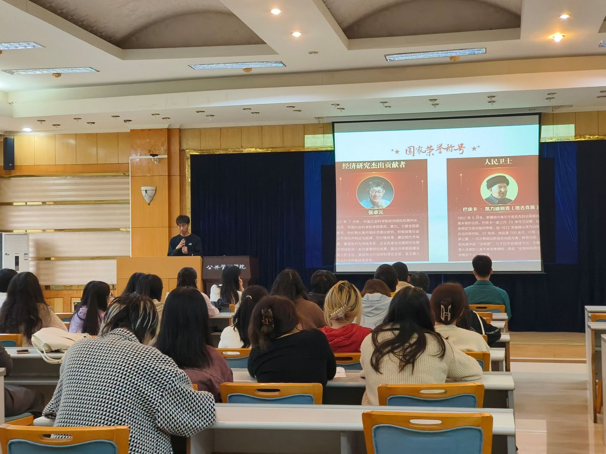 本科生三支部入党积极分子陶浩然带领大家重温了习近平总书记在中华人民共和国国家勋章和国家荣誉称号颁授仪式上的重要讲话,特别介绍了共和国勋章、友谊勋章、国家荣誉称号获得者们的先进事迹和突出贡献,鼓励同学们以英雄模范为榜样,胸怀强国之志、锤炼强国之技、勇建强国之功,以只争朝夕的历史主动、主人翁的责任担当,接续奋进中华民族伟大复兴新征程。