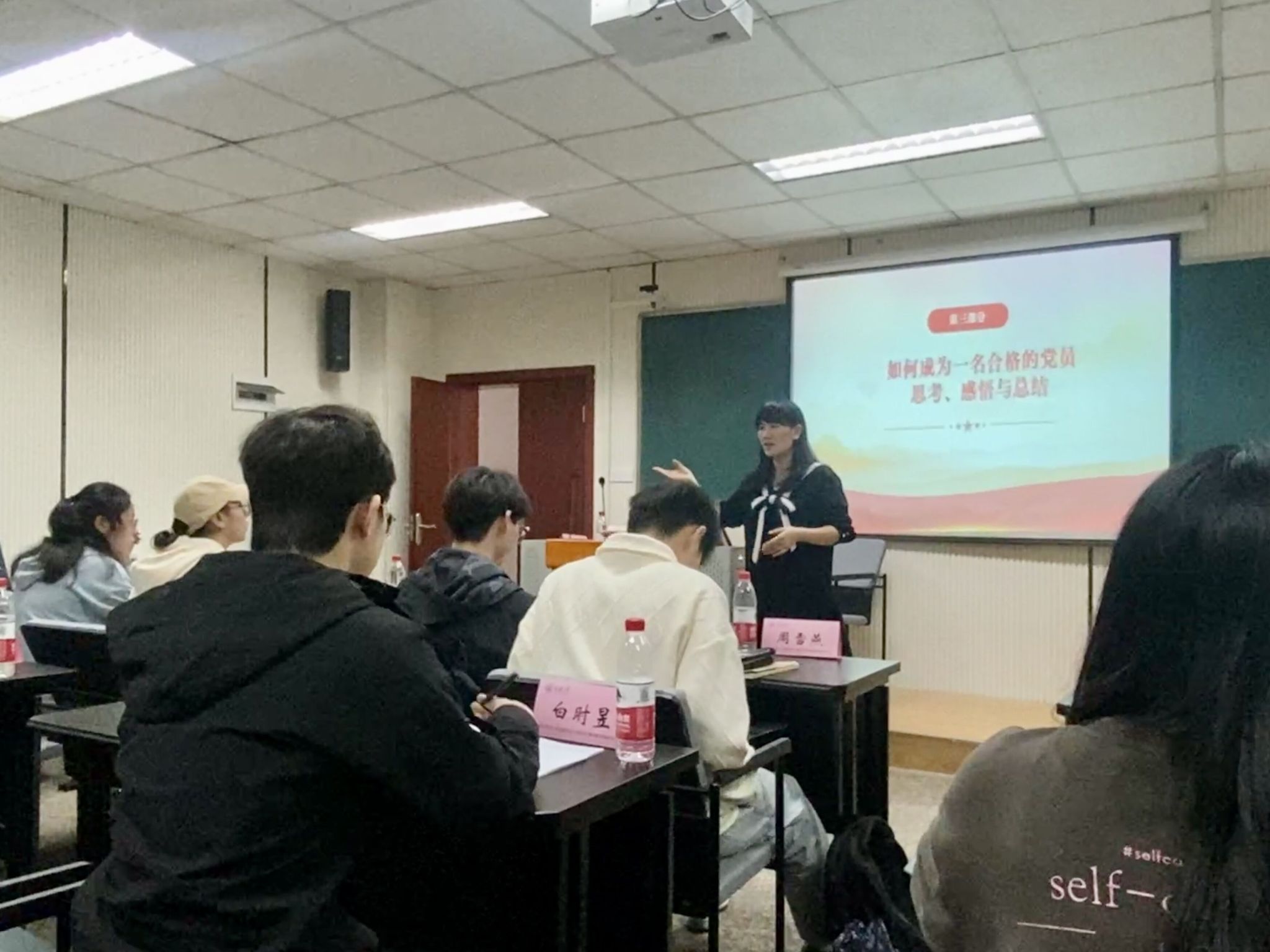 培训会上,本科生二支部支部书记徐柳老师按照入党流程所需要的档案材料依次作出全面详细的解释,规范了入党各类文书的书写要求。她给所有参会学生强调,入党的基本程序和要求、入党的文书以及写法等,凡是涉及入党材料都务必要书写严谨,要严肃对待入党工作,认真完成每一次党课培训,端正入党动机和态度,认真做好入党相关材料的准备。