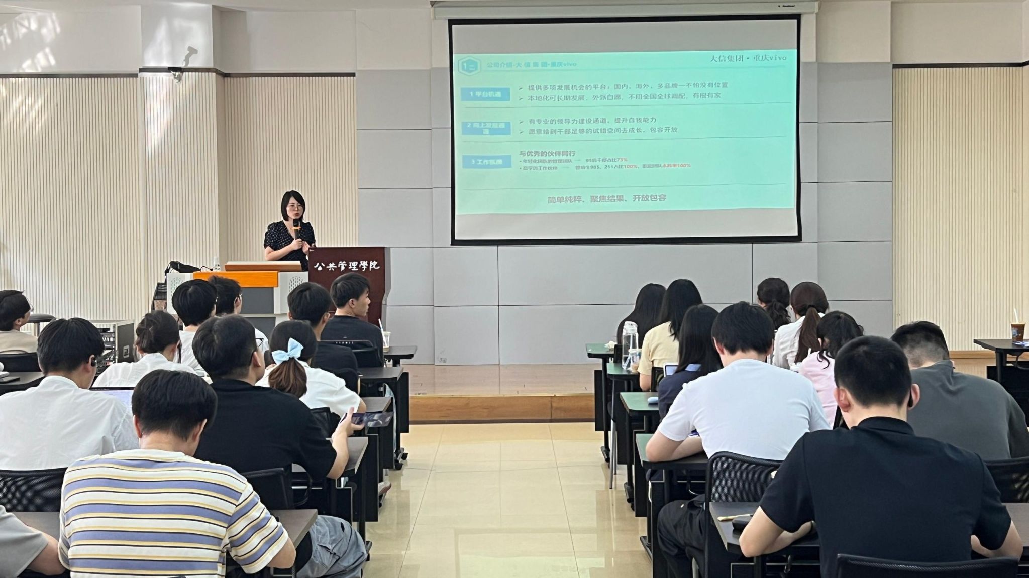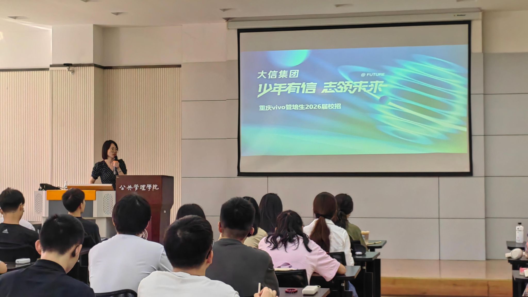 宣讲会现场,VIVO公司人力资源部负责人以“少年有信,志筑未来”为主题,从企业平台、职业发展、工作氛围三个维度深入介绍重庆VIVO。她谈到,VIVO作为大信集团旗下核心品牌,为毕业生提供“国内+海外+多品牌”的多元发展机会:既支持毕业生扎根本地长期深耕,也充分尊重个人意愿,无需强制参与全国或全球调配,让学子能在“有根有家”的环境中稳步成长。