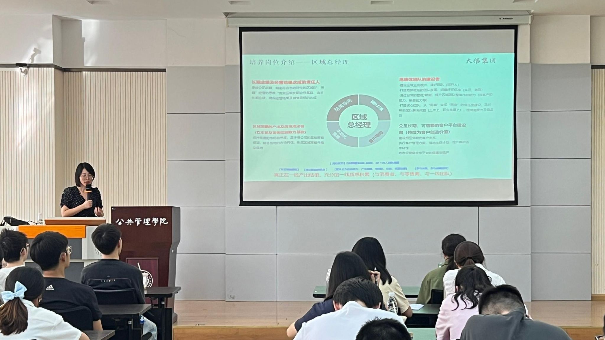 随后,张女士聚焦“区域总经理”等管培生核心培养岗位展开解读。她详细阐述了区域总经理的核心职责,并同步介绍了岗位成长路径、薪资福利体系及招聘具体要求,让同学们对职业发展前景有了更清晰的认知。