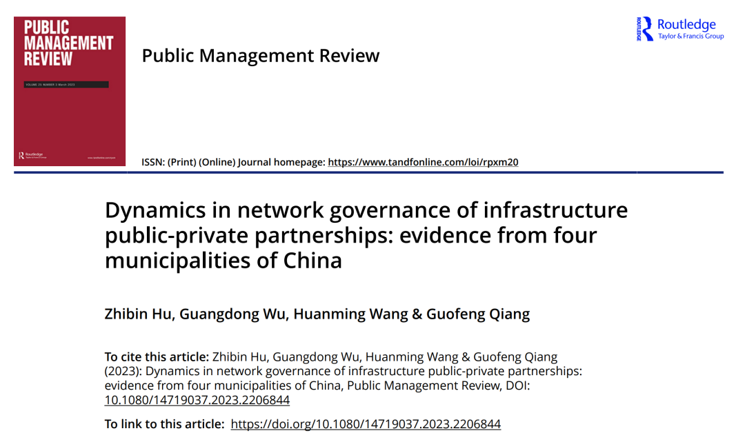 吴光东教授作为通讯作者的文章《Dynamics in network governance of infrastructure public-private partnerships: evidence from four municipalities of China》在公共管理学科顶尖期刊Public Management Review在线发表。Public Management Review期刊在管理学类别中位于一区(Q1),影响因子在公共行政和公共政策领域SSCI期刊中位列第三,是公共管理学科五大权威期刊之一。该文章是由吴光东及其指导的博士研究生胡志斌(论文第一作者, 电影天堂