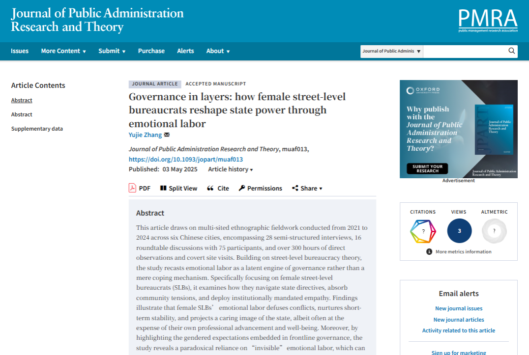 张煜婕博士作为唯一作者的学术论文“Governance in layers: how female street-level bureaucrats reshape state power through emotional labor”(分层治理:女性基层公务员的情感劳动),在公共管理领域国际顶级期刊Journal of Public Administration Research and Theory(JPART)正式发表。