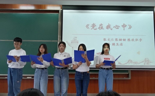 开场,主持人首先进行了规则介绍。随后,比赛正式开始。经过精心的准备,参赛同学们自信从容地走上讲台,伴随着舒缓深的音乐,声情并茂地朗诵大家耳熟能详的经典作品。第六组的同学们身着洁白的衬衫,以一首《党在我心中》,将党的历史娓娓道来。“诞生于南湖游船,犹如天际升起的朝阳……”秋收暴动、万里长征;建三峡、收港澳……一幕幕历史浮现在我们眼前,展示着党的光辉岁月。第四组的同学们带来了方志敏同志在狱中写下的绝唱——《可爱的中国》,百年沧桑,历史的车轮缓缓碾过,我们饱经风霜的祖国母亲早已摆脱了帝国主义的压迫。而今,富裕代替了贫穷,康健代替了疾病,明媚的花园代替了暗淡的荒地,一代又一代的中华儿女通过不懈地奋斗,将革命先烈梦想中的光明前景和幸福景象照进了现实。最后一组的同学带来《相约第一百个春天》,激情澎湃的朗诵高喊出我们与党的伟大约定。而今,在进军“两个百年”伟大目标的征程里,我们接过镰刀锤头,接力起一脉相承的中国梦,相约复兴。一阵又一阵如雷动般的掌声之后,本次比赛接近尾声。