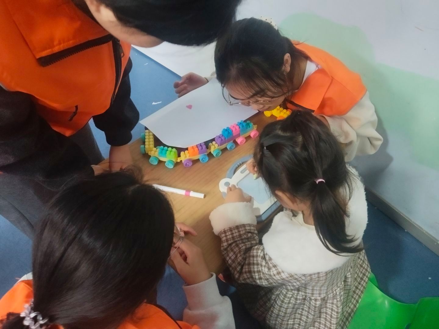 活动过程中,每两名志愿者对接一位小朋友,保证每一位小朋友都有人陪伴。小朋友们喜好各异,一些孩子通过磁画板表达出自己内心的奇思妙想;一些小朋友在搭各种形状的积木,志愿者偶尔会与小朋友互动讨论;一些小朋友喜欢在大堂玩游乐设施,志愿者就不辞劳苦地紧跟其身后,全力保护小朋友的安全。