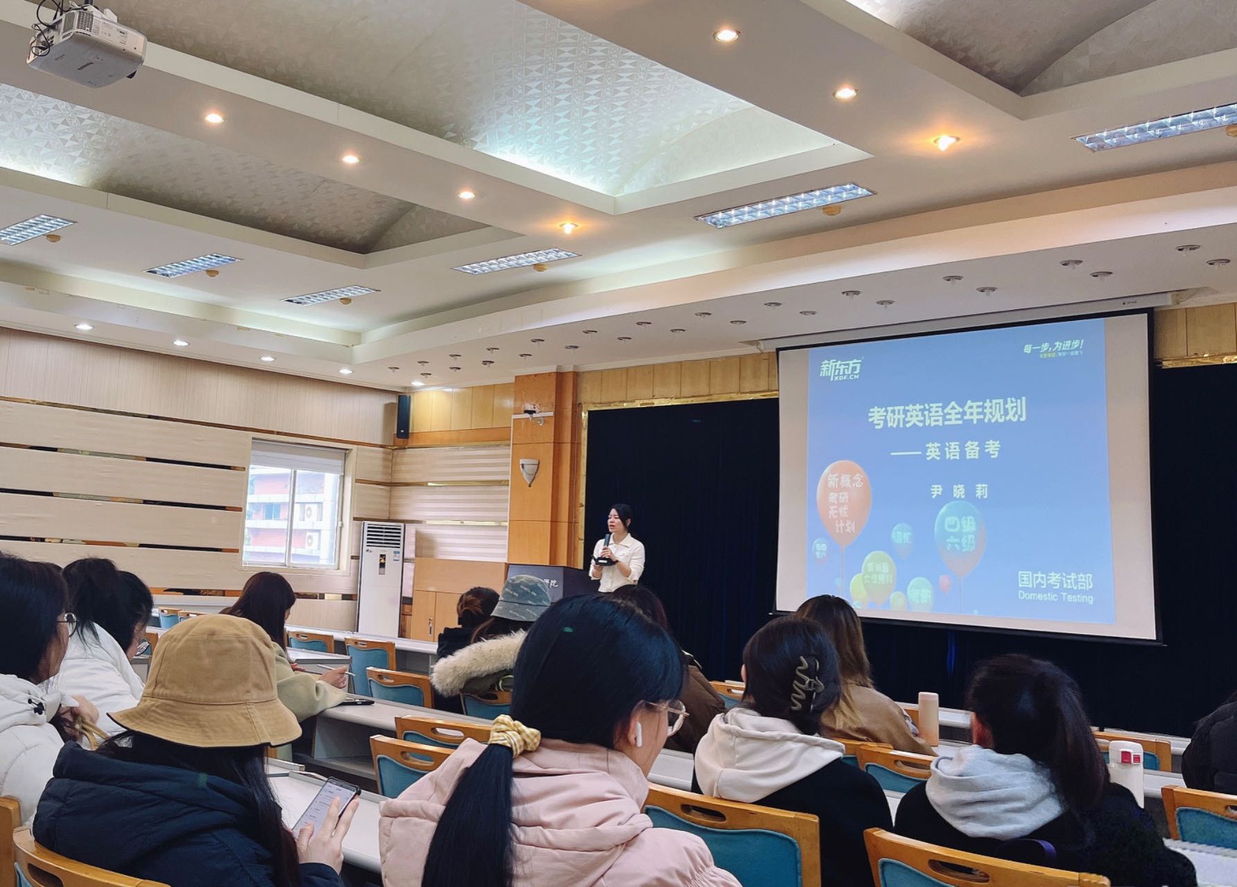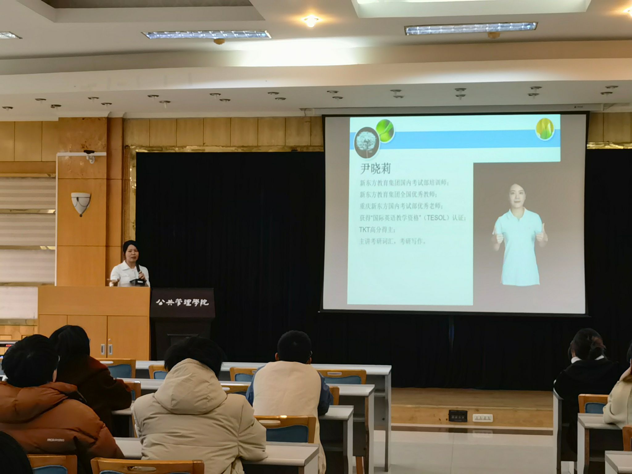 邀请到新东方教育集团的尹晓莉老师在学院楼202多功能厅,为同学们带来一场2025年升学考研英语全年规划与备考指导会。会议由学院团委书记兼2021级辅导员徐柳老师主持,2021级70余名有升学、考研意向的学生到场参加。